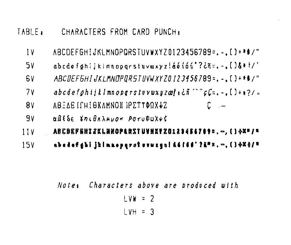 The character space size and row size to be used by RITE2V depend upon the character size and the space required to prevent overlapping of characters. Since the characters in the tables normally used by RITE2V are based on a 5 × 7 lattice, the character size is, usually, 4*LVW by 6*LVH. (For the $ sign, it is 4*LVW by 7*LVH.) Also, since LVW=LVH=3, the character size is 12 by 18, unless changed by CHSIZV. The standard quantities ISPACE and IROW used by RITE2V are l8 and 24, respectively, allowing sufficient space to prevent overlapping of characters.