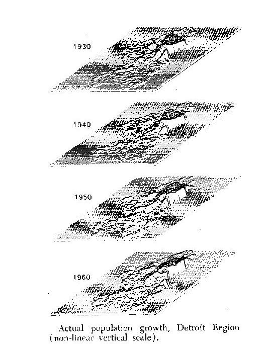 Conceptually, I have been influenced by Borchert's model of the twin city region [2]. This was later applied to Detroit by Deskins, and I have used his data [8]. As formulated by Borchert and Deskins the model is in graphical form and suggests that the lines of growth coincide with extrapolations, modified by local conditions, of the orthogonal trajectories to the level curves of population density. The difficult step is to estimate the amount of growth along these trajectories, Presumably this is proportional to the population pressure, or the gradient of the population density [23].