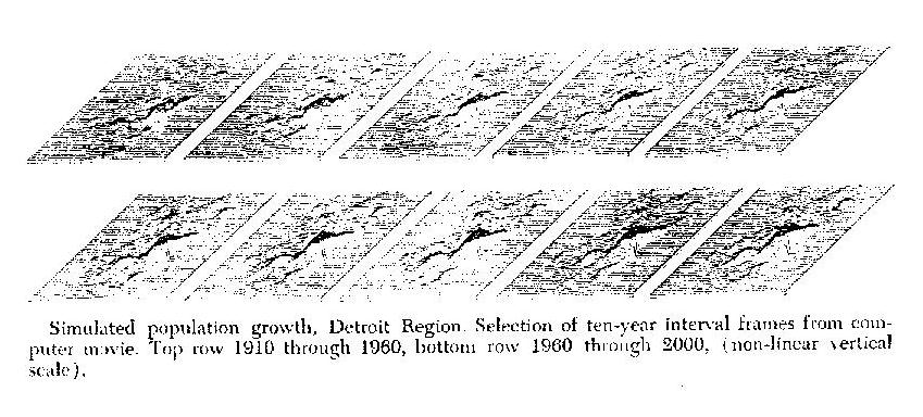 For the initial computer movie [19] the equations used are P1930+Δtij=ΣΣWpqP1930, with p and q ranging from -2 to +2, and with Wpq = Apq + BpqΔt, where Δt is measured in years from 1930. Apq and Bpq were obtained from the coefficients given in the earlier paper [33] by weighting the 1950/60 coefficients twice as much as the 1930/40 and 1940/50 values. An additional movie, giving equal weight to all of the time periods by using Wpq= Apq + Bpq Δt + Cpq(Δt)2 may be more realistic. Both of these models describe time variant systems [3]. The movies simulate from 1910 to 2000 in time steps of Δt= 0.5 and Δt= 0.05 years. A time step of one frame per month would appear to be the most appropriate speed, assuming viewing at 16 frames per second. An interesting question is whether the same coefficients could he used for some other urban region of the United States since the exogenous conditions are obviously relatively constant.
