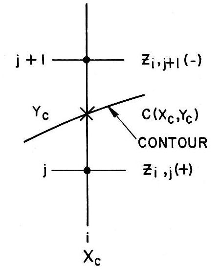 The second condition is that linear interpolation is sufficient to find the endpoints of a contour line between two adjacent Z values. The case of Z values being the same as the contour value must be taken into consideration. We always treat equal values the same as values above the line. For a contour line passing between two Z values, one Z value must be above the contour line value (+), the other below (-). Consider the case where Zi,j is above the line and Zi,j+1 is below the line in Fig. 2. The wanted endpoint of the contour line of value C is then determined as follows: