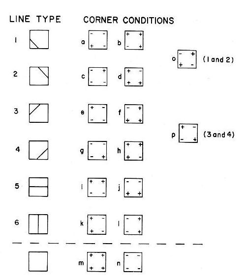 It is in the determination of which Z values to interpolate that the two contouring methods differ. The simplest logic is in what we call the cell-at-a-time method, which is efficient for a CRT type of contour analysis since a pen does not have to be raised and lowered into above or below the contour line. If all are above or all below, there is no contour line segment at that level in the cell. As shown in Fig. 3, the remaining l4 possibilities fall into one (or two) of the 6 possible line types from which the contour segment can be determined explicitly. The ambiguous cases (Fig. 3, o and p) are arbitrarily assigned, since it is necessary only to preserve consistency of treatment.