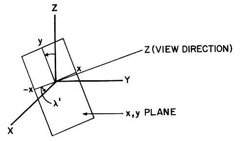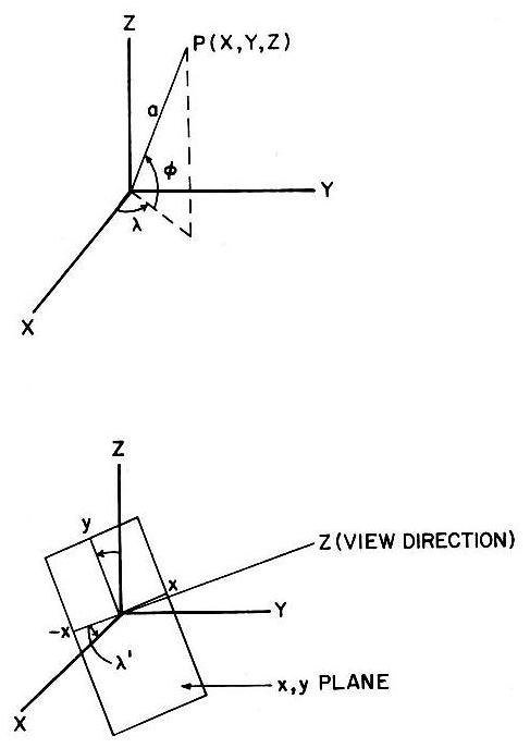 Verification of the above equations can be made by referring to the schematic of Fig. 10. The plane of projection is defined by x,y coordinates. As shown in the lower part of Fig. 10, we can rotate counterclockwise the x axis of the plane to the X axis of the sphere through the angle λ+90°, and rotate the y axis to the Z axis through the angle 90°-φ. This gives all of the axes coincidence, and yields the above transformation equations (explained by Baldwin, 1963). We should point out that if the transformed point (xa,ya,za) has a negative z value, then that point is not visible, i.e., it is beyond the horizon. There is a great deal of distortion around the horizon in the orthographic projection. However, this projection can be centered over any given point on the globe, and it is used when a particular area is of special interest.
