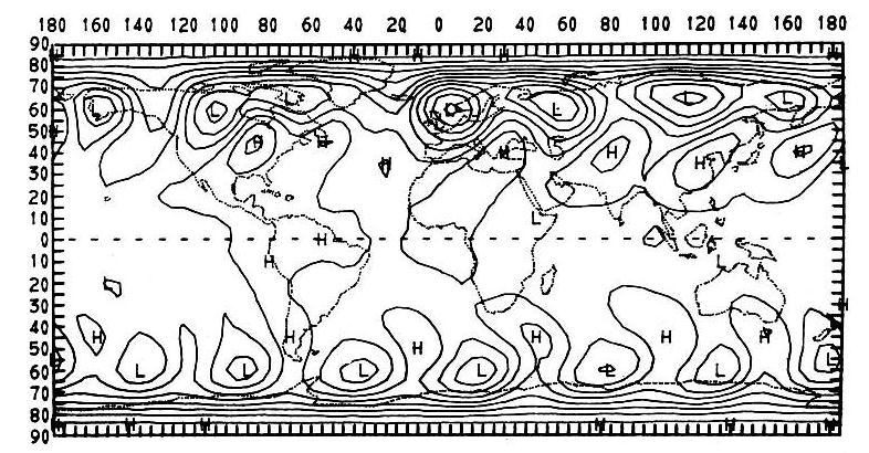 where a is the mean radius of the Earth. One advantage of the cylindrical equal-spaced projection over other commonly used cylindrical projections, such as the Mercator, is that the entire globe is visible. The scale is preserved at the equator, and distortion increases toward the poles. The poles are greatly exaggerated since the single polar point has been stretched out over the entire longitudinal range. Since the grid data of the NCAR model are at latitude-longitude intersections, and the cylindrical equal-spaced projection is basically in rectangular coordinates, the data from the model are contoured on the projection without transformation.