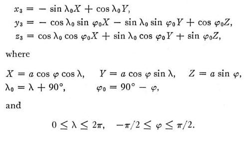 The orthographic projection (Fig. 9) shows the globe as observed from infinity, and gives the viewer the illusion of perspective and depth. The spacing of parallels and meridians is not uniform (Steers, 1962). The transformation of a point (X, Y, Z) on the surface of a globe to a point (x3, y3, z3) on a plane that passes through the center of the globe will be given. We shall assume that the perpendicular of the plane is centered over a fixed latitude po and longitude M. The transformation equations are: