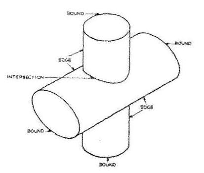The lines appearing in a drawing are of three kinds: the intersection of two surfaces, the intersection or a surface and one of its bounds, and the extremal points of a surface which are not a boundary, referred to hereafter as intersections, bounds and edges, respectively (See Figure 1).