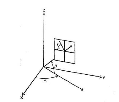 F. Point of View. In its canonical form the picture plane is assumed to be parallel to the y-z plane and the x and y axes of the picture plane, parallel to the y and z axes respectively.Then if α is the azimuth of the vantage point measured counterclockwise from the x-axis about the vertical z-axis in the horizontal x-y plane, β is the elevation of the vantage point above the x-y plane, and γ is tho counterclockwise rotational position of the picture about the vantage direction, the direction cosines of the line of view, λ, μ and ν, and the coordinates x',y' in the picture plane corresponding to the point x, y, z in three-spaoe are derived from the three input angles, α, β, γ in the following way: