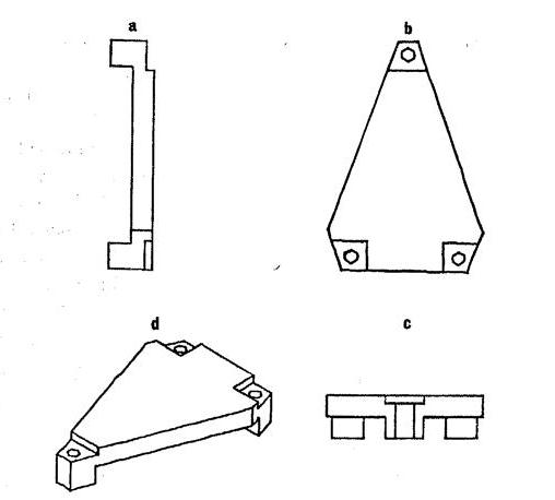 All the bounds of the mounting plate were omitted. If they were included superfluous lines would be drawn between sections of the same surface. The subroutine for getting intersections ignores parallel planes. On general, if a picture represents a completely enclosed solid body whose surfaces consist of planes, it is not necessary and indeed undesirable to draw the bounds.