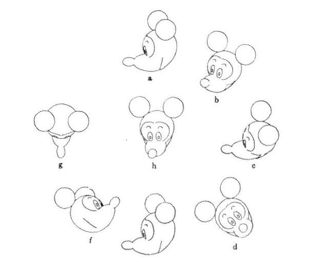 In the case of Mickey Mouse all the views were produced with the same equations of type (1) and type (2); only the picture plane parameters were changed for different views. Mickey's head and ears are spheres, his snout and nose are ellipsoids, and the jaw which connects the head and snout is a piece of an ellipsoid. All the intersections (as defined in the Introduction) were omitted to give the artistic effect (see Figures 6a-g).
