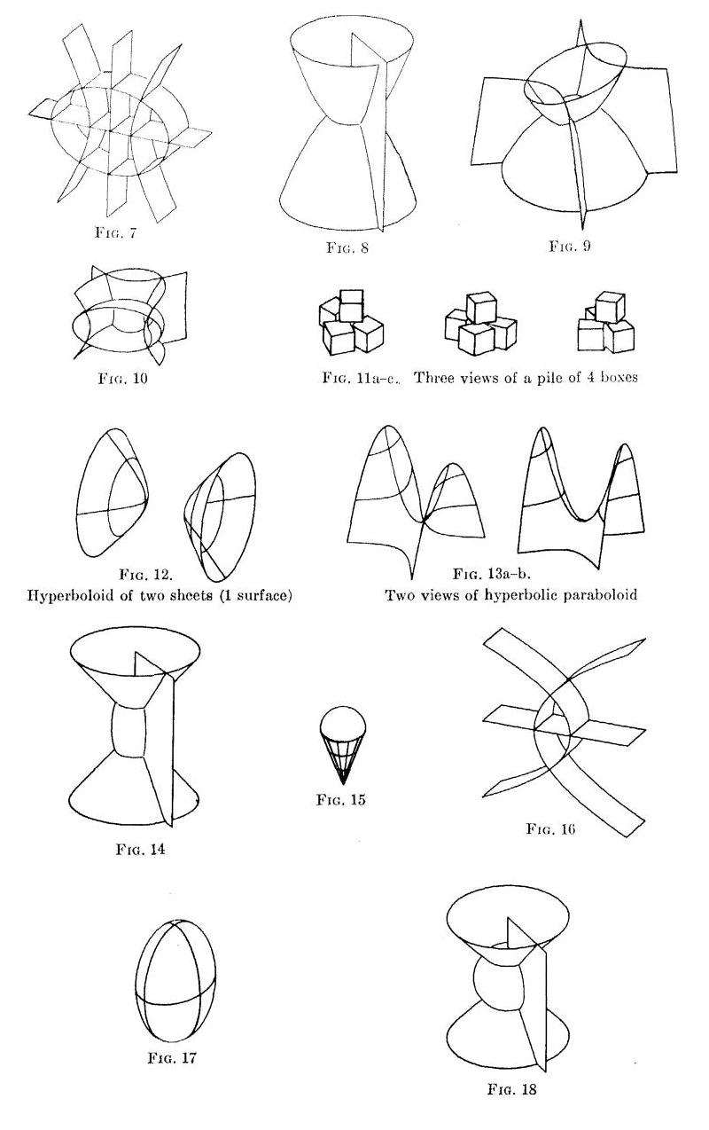 The choice of quadric surfaces for the general program was made for practical and aesthetic reasons. While there are many geometrical figures consisting of planes alone, the vast majority of objects in the real world contain some curved surfaces. A program for drawing pictures would not be very useful if it did not at least include a provision for the simplest of these, namely quadric surfaces. In drawing the curves of the picture it was found that a great many calculations for each point had to be made. If surfaces of higher degree than two were considered, the storage space and the machine time used would become too large to be practical; however, the program for drawing quadrics has proved versatile enough to produce some quite complicated pictures.