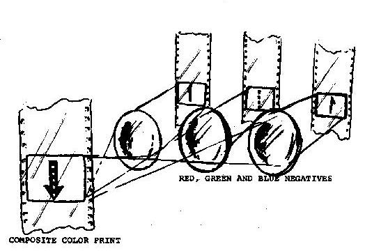 These three strips must be printed in register, each with a different color filter, to produce a final color negative. It's just like color separation work in printing. Dreary technical concerns prevent production of fully saturated color pictures right from the scope onto color stock.