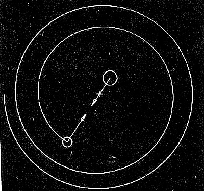 In the movie the positions of the satellite and parent bodies are drawn on a frame of film every minute of their orbits(DELT= 1.0) for the first 1000 minutes (TFIN)= 1000). The satellite and parent body, obeying an inverse cube gravitational law (EXP =3), start out in circular orbits. However, as you have shown in class mathematically, circular orbits for an inverse third power gravitational law are unstable. The 1000-frame (42-second) movie drives home the point; the students see the initial, almost perfectly circular orbits disintegrate, with the satellite making ever-closer swings about the parent body until the two bodies collide.