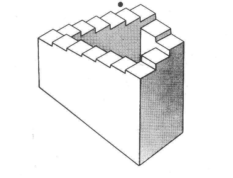 Another educational movie by Roger N.Shepard and the author is entitled A Pair of Paradoxes. It combines two psychological phenomena discovered recently. One, due to L. S. and R. Penrose of the University of London, is a winding stair case that seems to go ever upward while at the same time closing upon itself after each circuit. The other, due to Shepard, is a tone that seems to go ever upward while at the same time remaining near the middle of the scale. Figure 9 is a frame from this movie.