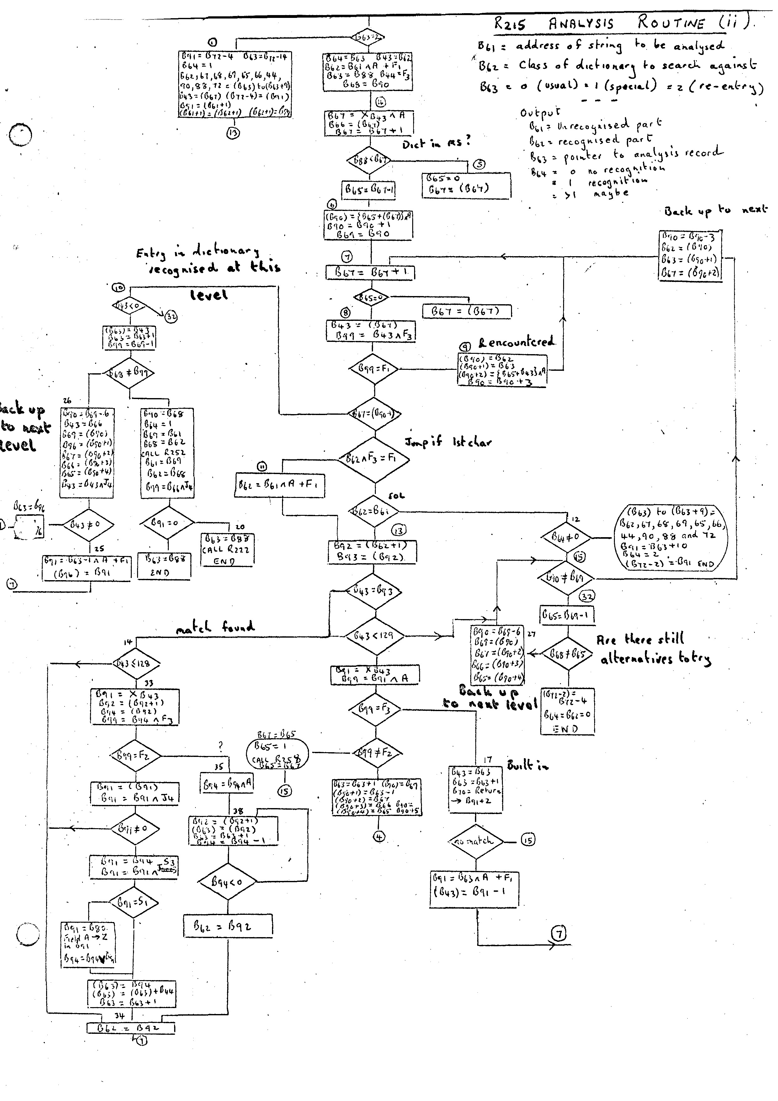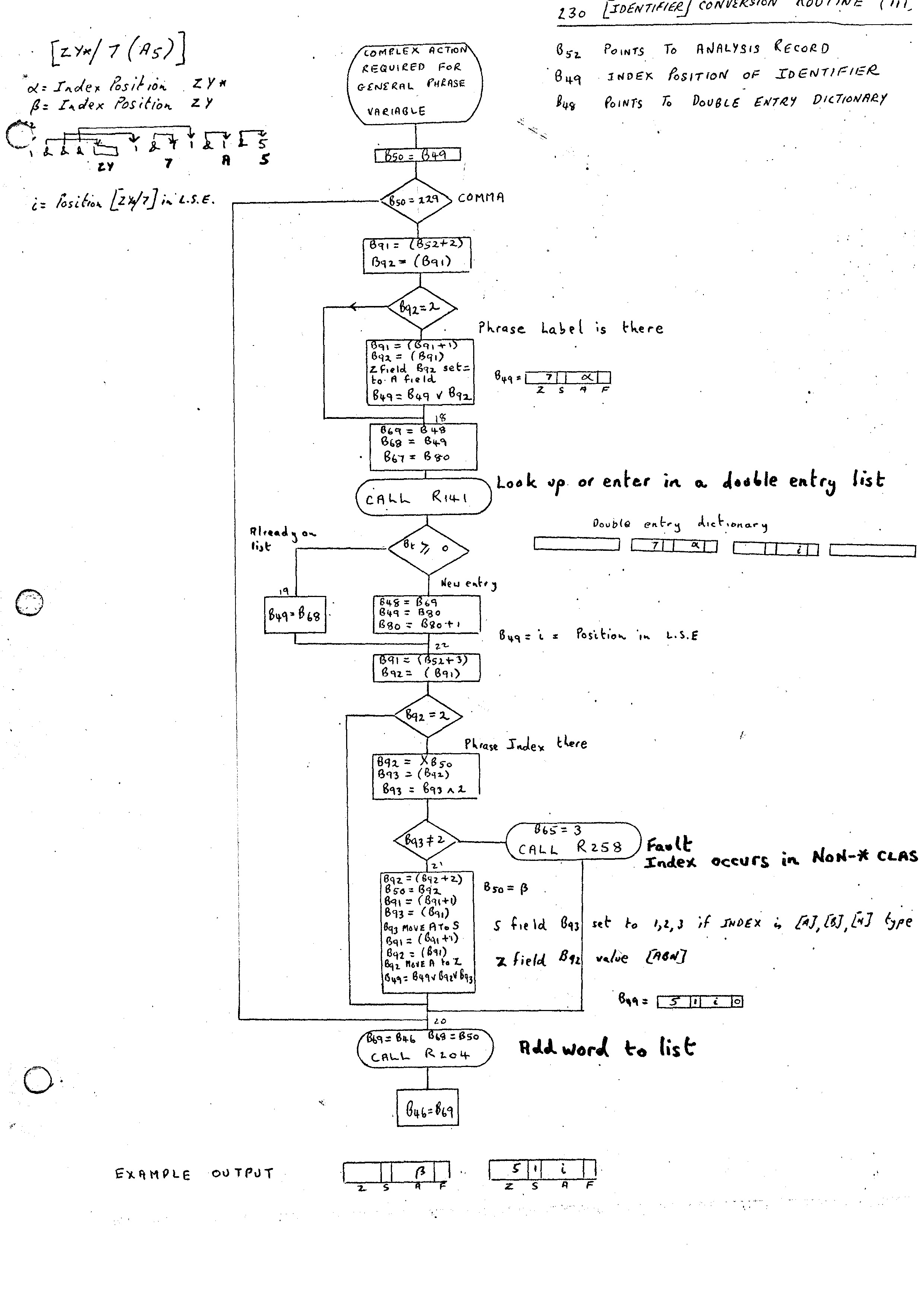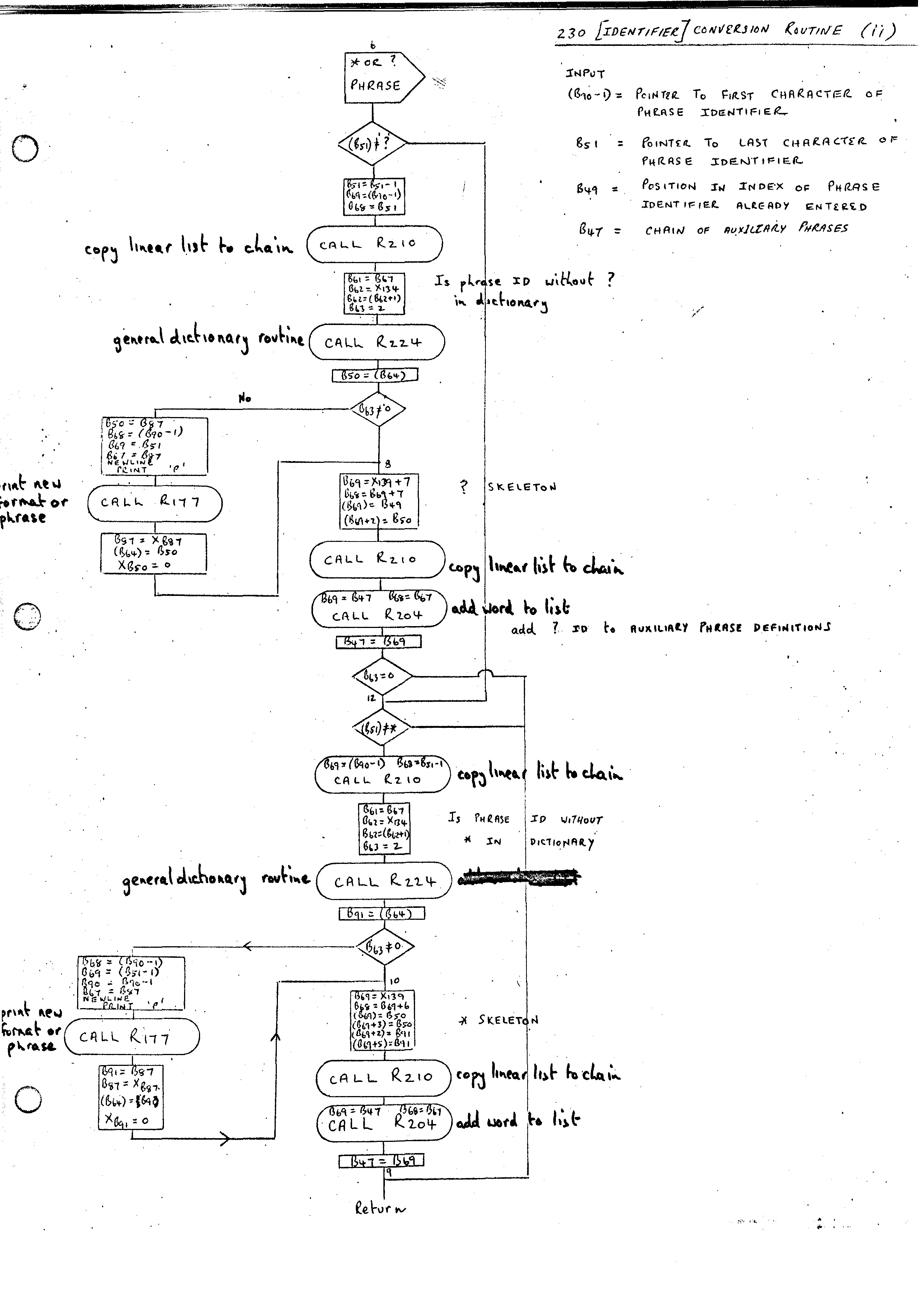Like the PHRASE and FORMAT statements, the whole of the ROUTINE is input initially, and the Phrase Variables are converted using the Identifier Conversion Routine 230 (flow diagrams (i), (ii), (iii)). In the case of the ROUTINE statement Phrase Variables rather than Identifiers appear. These may have labels and indices attached, and the output from the routine is more complex than the Index Position produced in the case of the PHRASE and FORMAT statements. This alternative path is marked by B78 being set to zero on entry. The additional part of the Identifier Conversion Routine is given in flow diagram (iii).