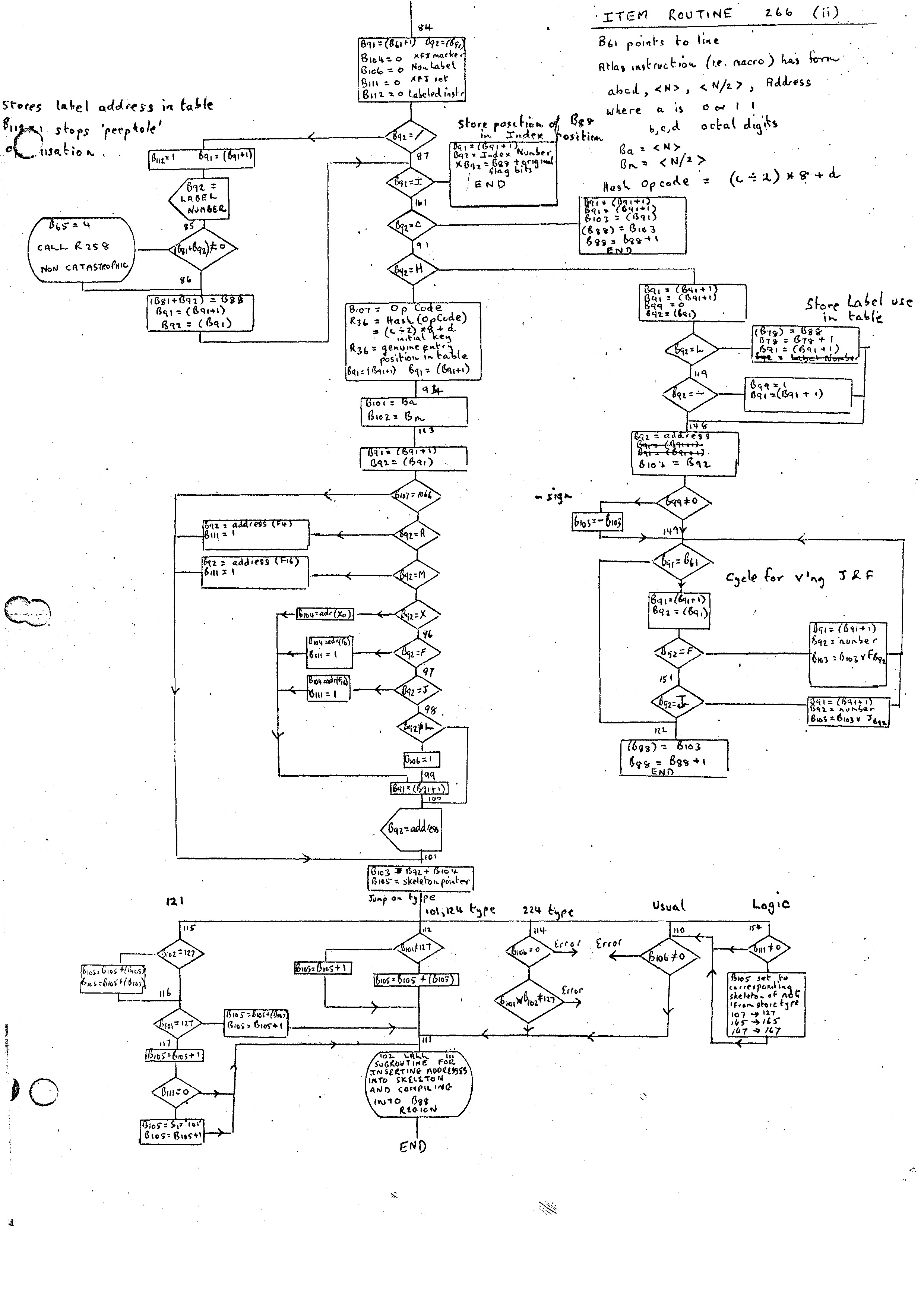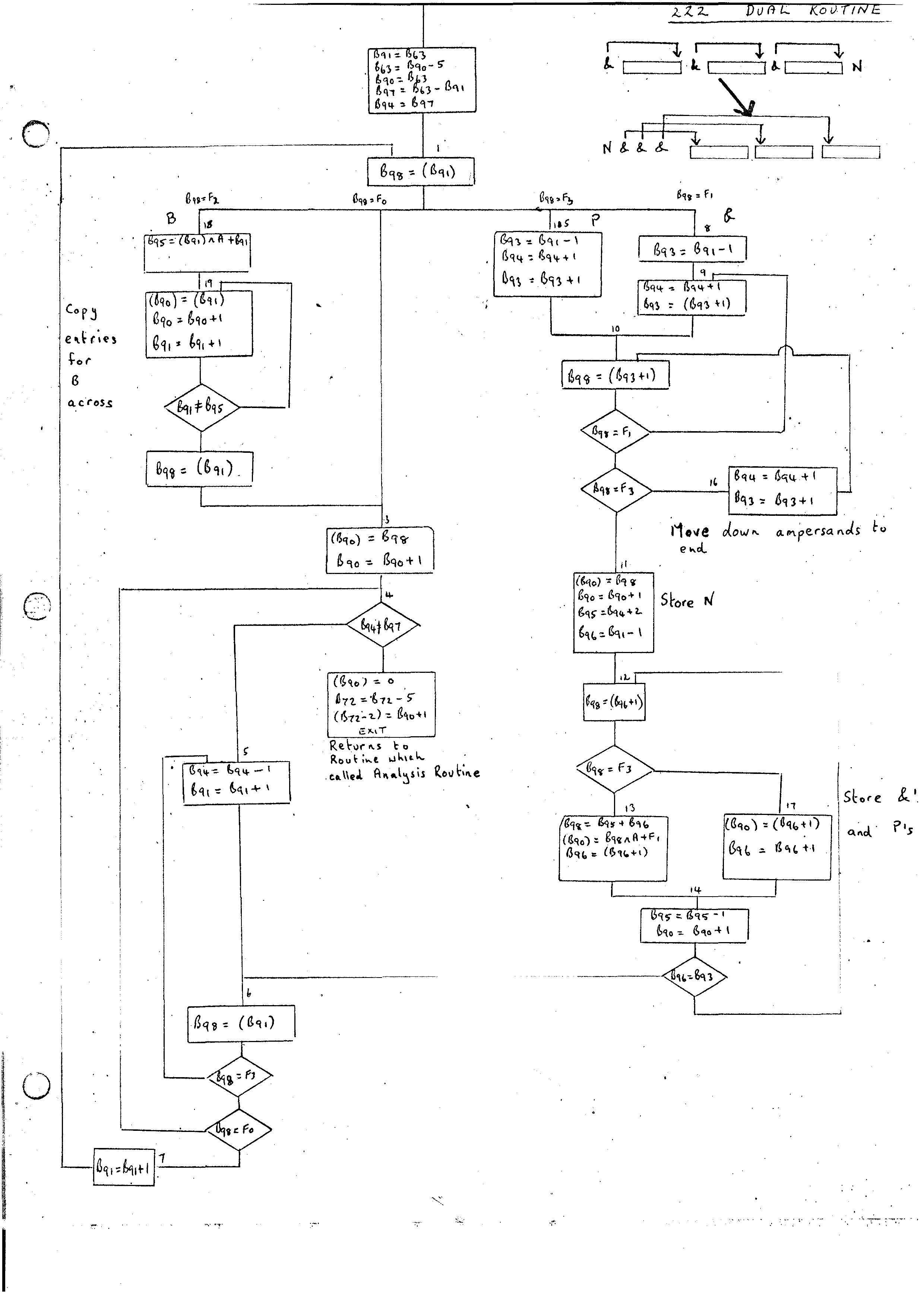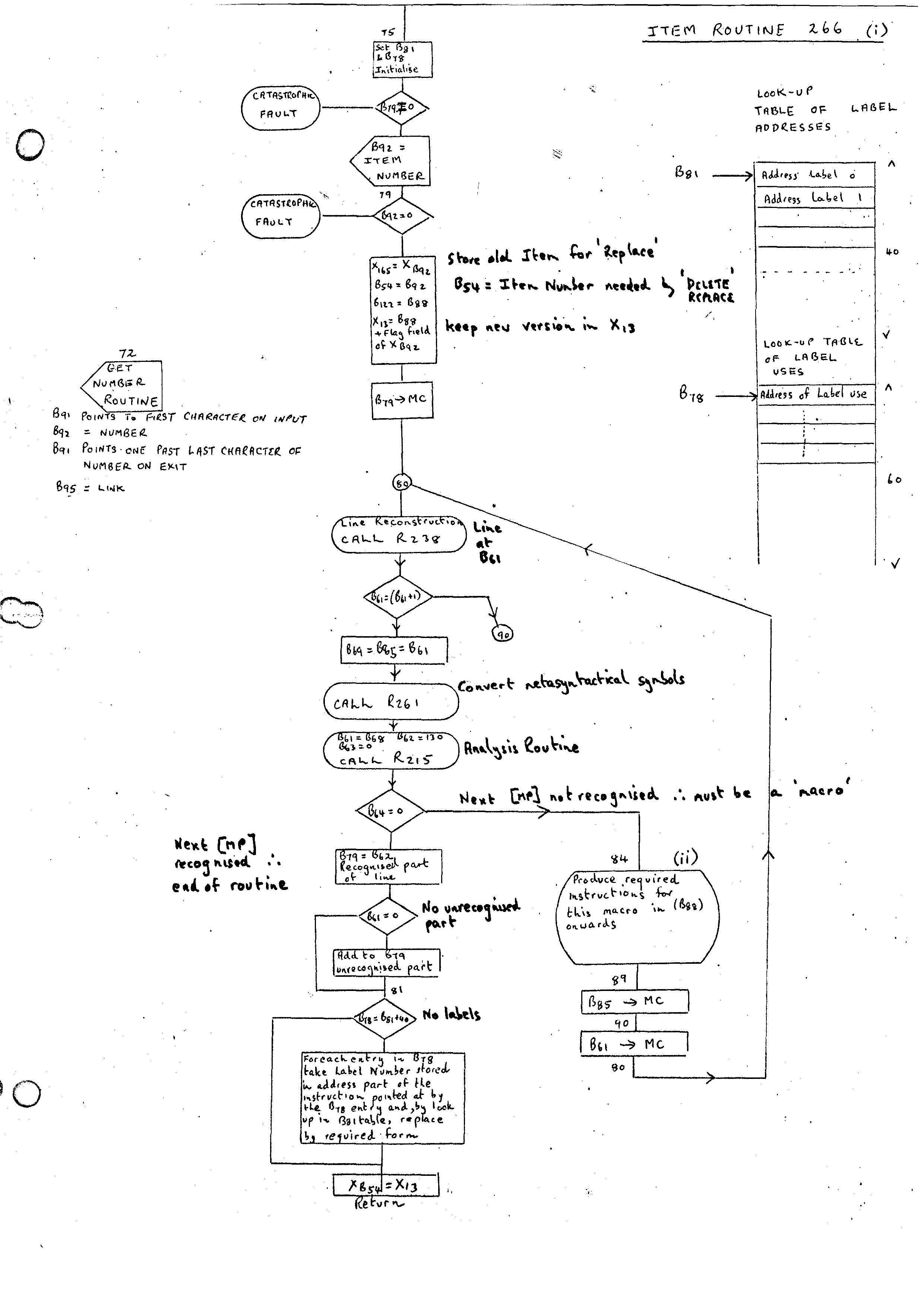 Like the PHRASE and FORMAT statements, the whole of the ROUTINE is input initially, and the Phrase Variables are converted using the Identifier Conversion Routine 230 (flow diagrams (i), (ii), (iii)). In the case of the ROUTINE statement Phrase Variables rather than Identifiers appear. These may have labels and indices attached, and the output from the routine is more complex than the Index Position produced in the case of the PHRASE and FORMAT statements. This alternative path is marked by B78 being set to zero on entry. The additional part of the Identifier Conversion Routine is given in flow diagram (iii).