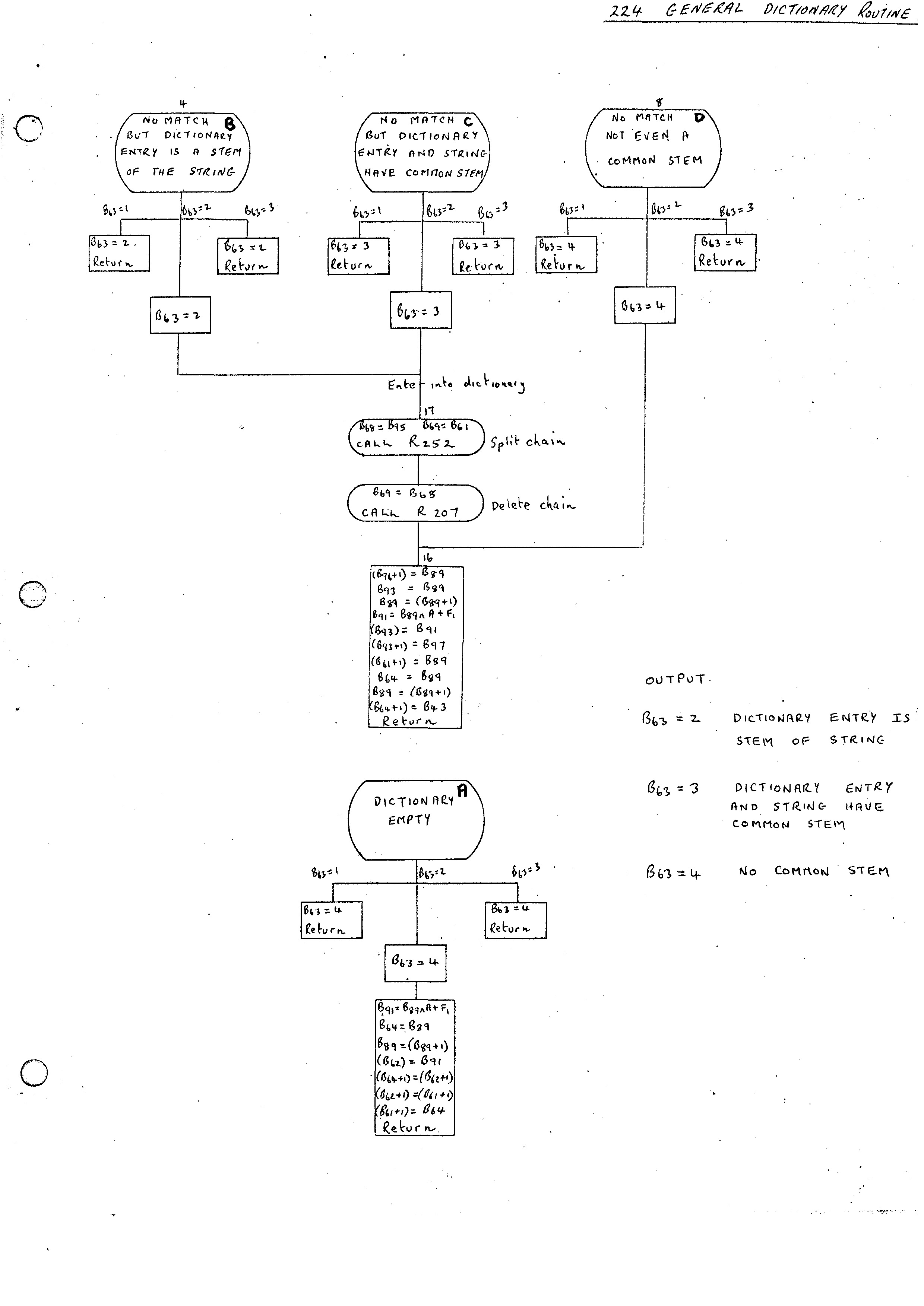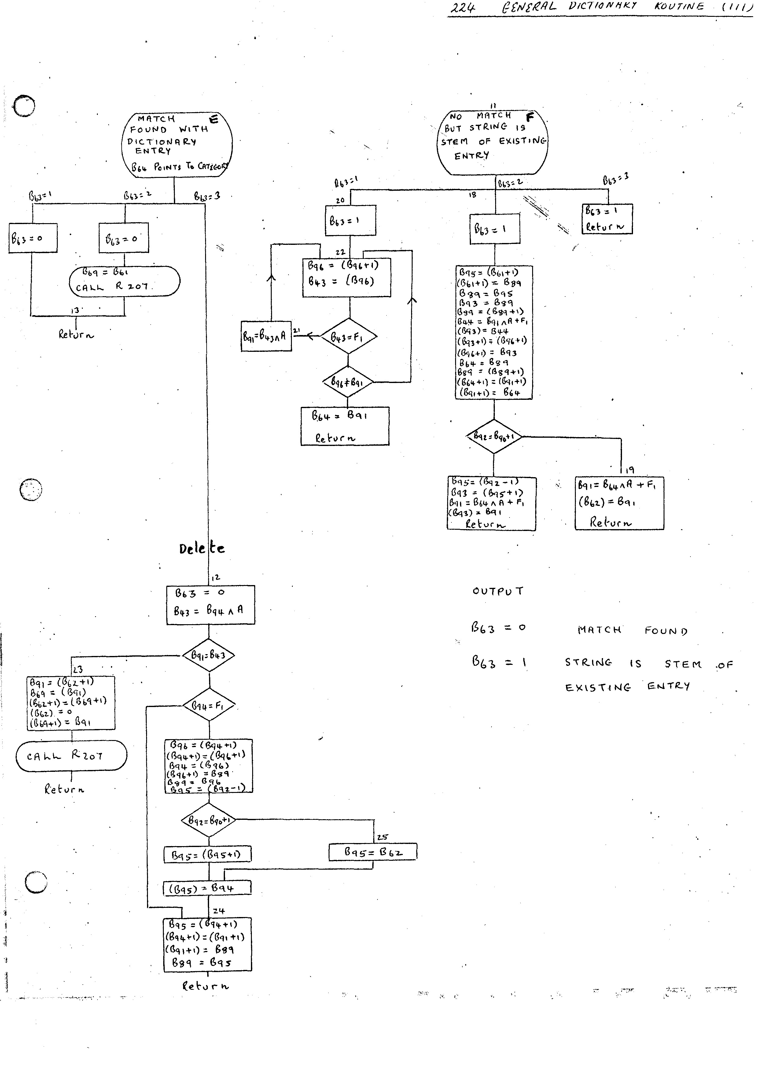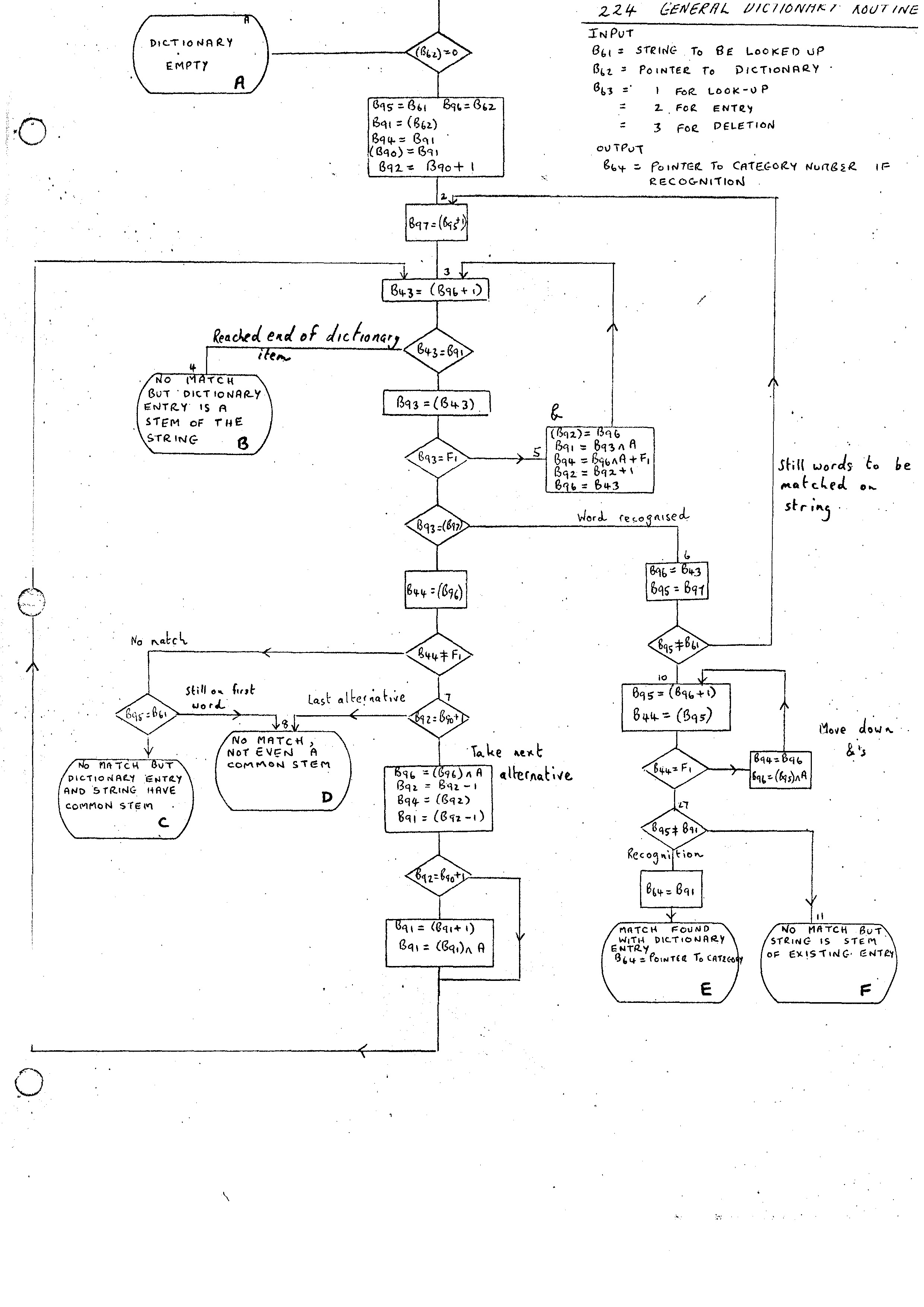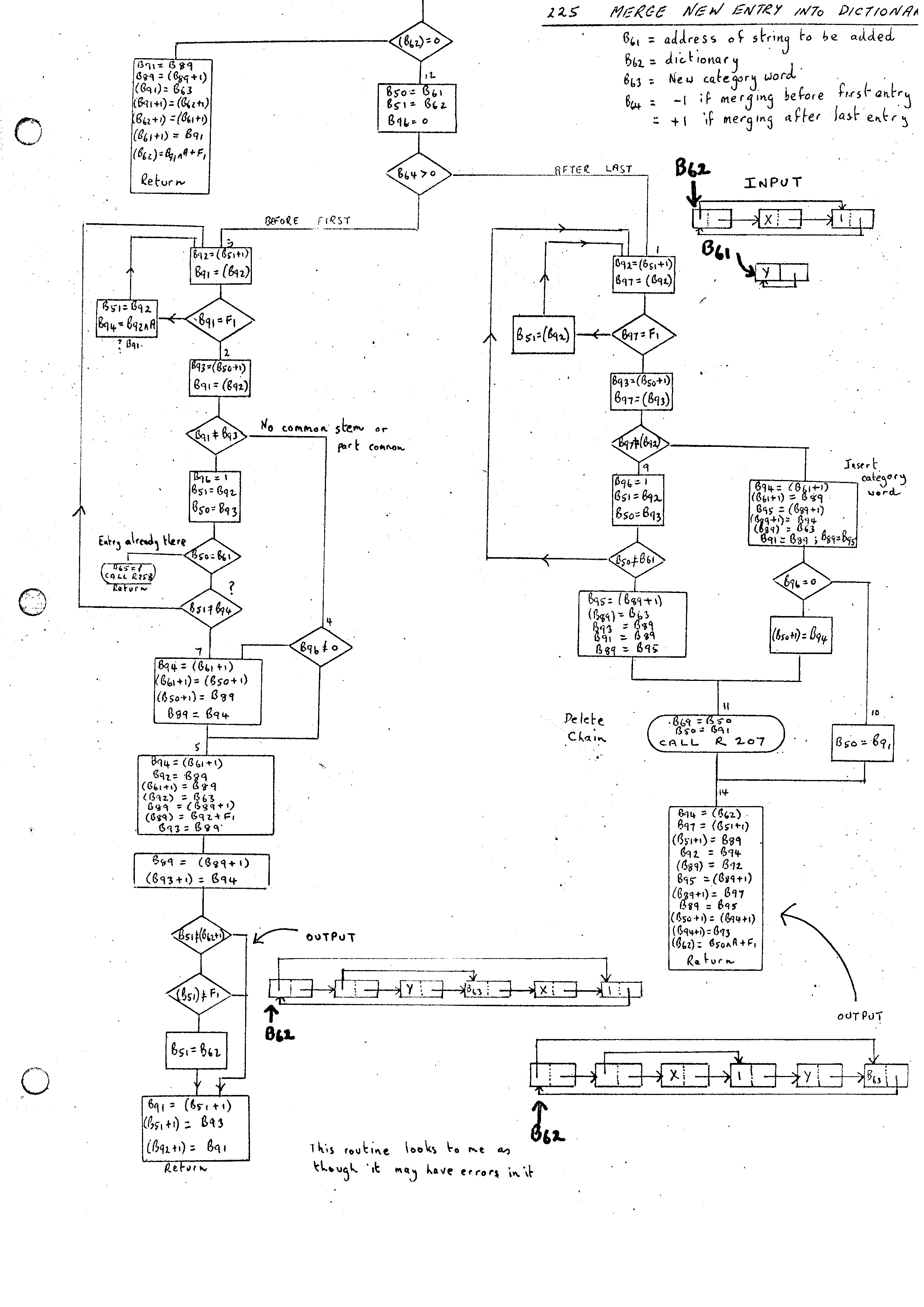 The output form R261 is, in general, a reduced and modified form of the original string. The Routine expects B69 to point to the input chain list and on exit will have built up the reduced line and have B68 pointing at it. The original line is unchanged and may be required if, for example, the statement is not to be analyzed with respect to the Master Phrase Dictionary. It may be worth introducing at this stage some comment convention for ignoring parts of the input section.