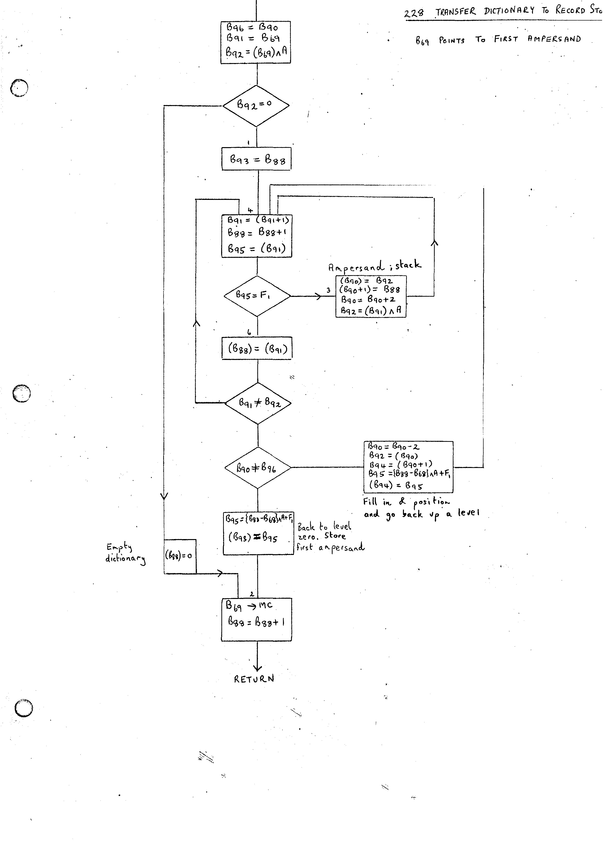 until all &'s of top level of analysis record have been copied into stack; that is until a word without Fl set is encountered. The rest of the workspace area up to B90 is then initialized to zero. This will be discussed in more detail later.