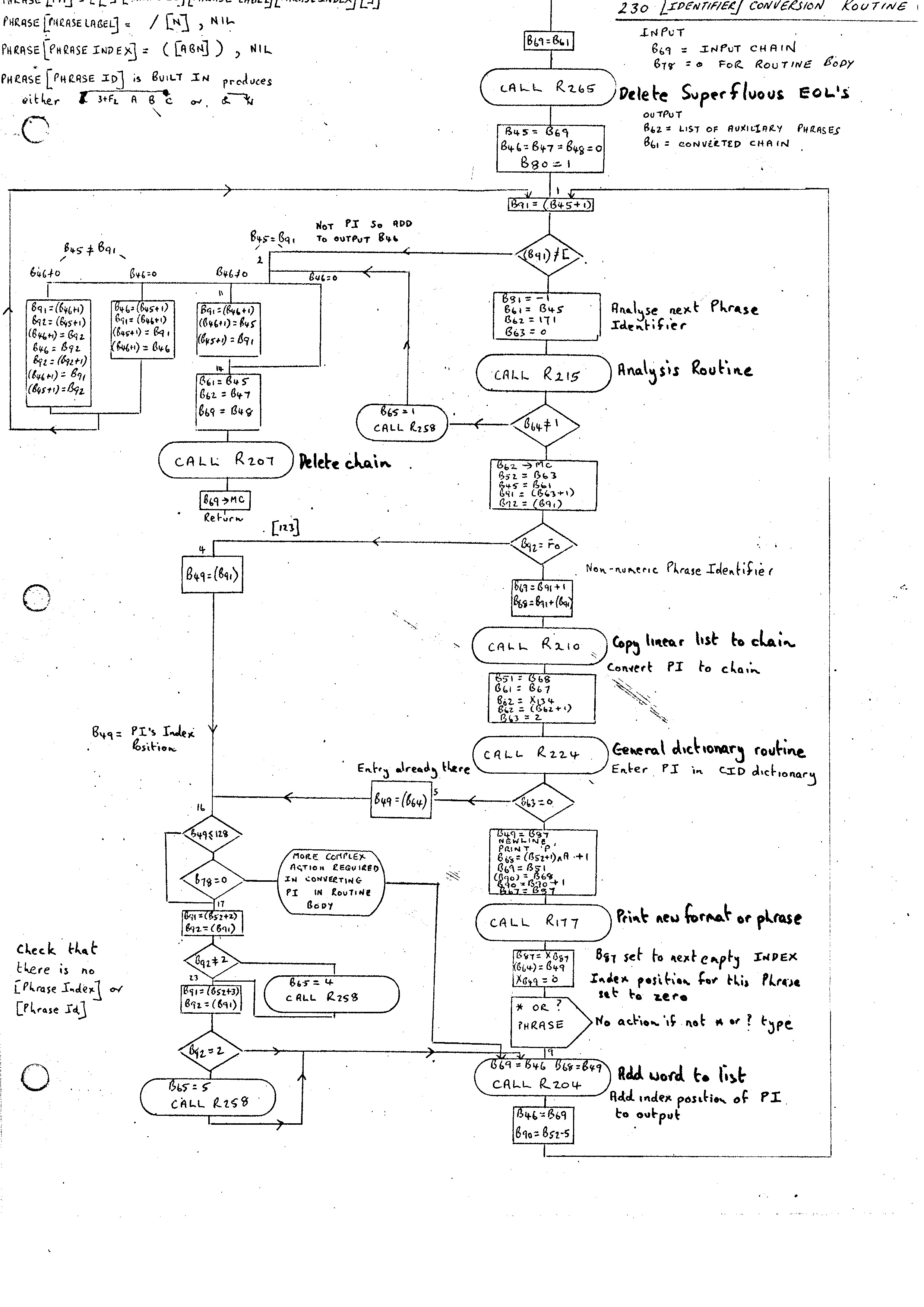 Routine 230 is also used by the ROUTINE routine for reducing the body of a routine and, for this purpose, it has to recognize and separate different phrase variables of the same type. In the case of the Phrase Routine entry (differentiated by B78 being non-zero) it has the task of replacing each Phrase Identifier enclosed in square brackets by its position in the index. Characters other than Phrase Identifiers are not changed.