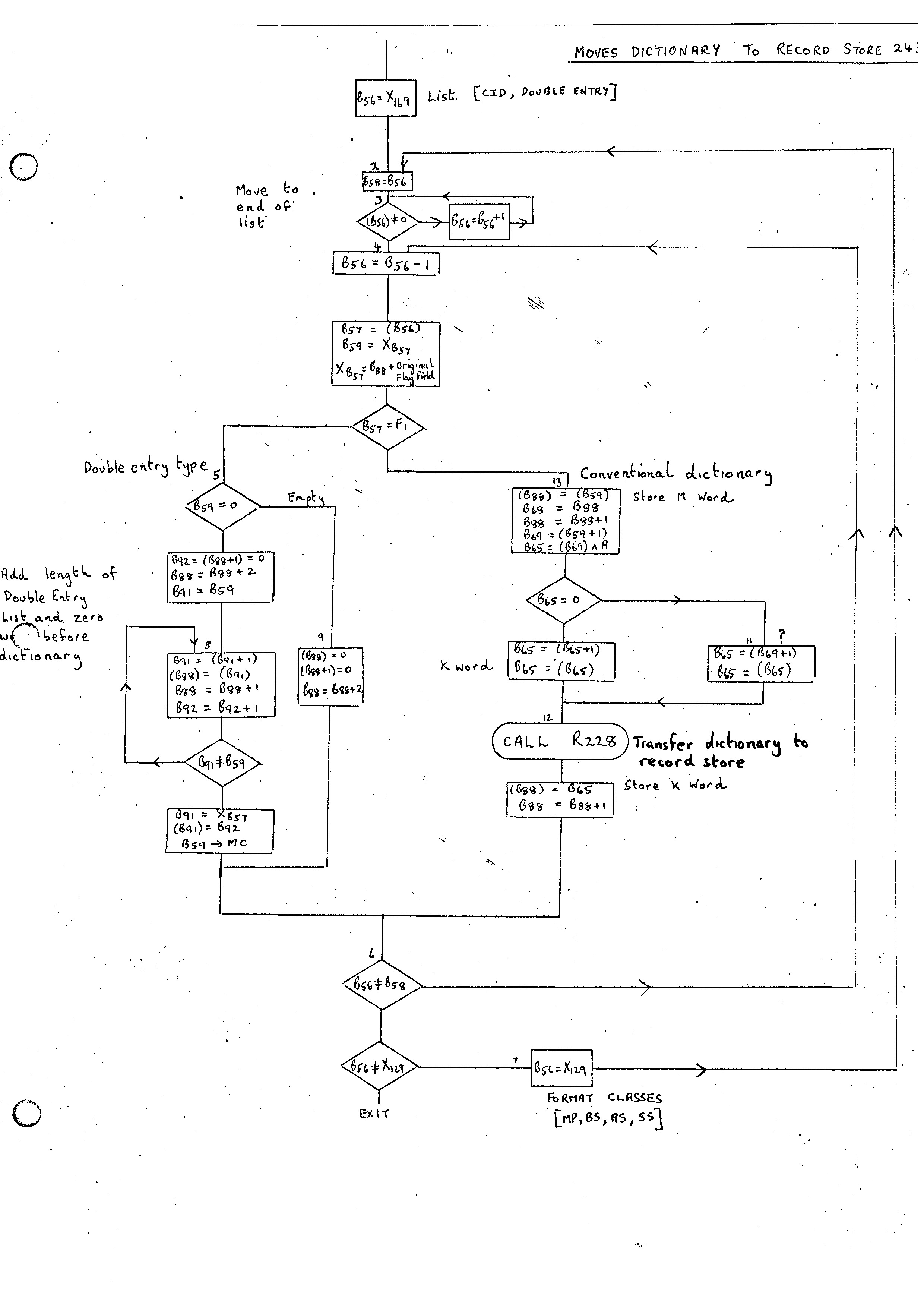 If the DOWN routine is entered for TRANSPLANT then entry is made at 4. In this case B77 will contain the position of the analysis record (≥ 0) and B92 set to Index position of analysis record. In this case between 6. and 7. is inserted:-