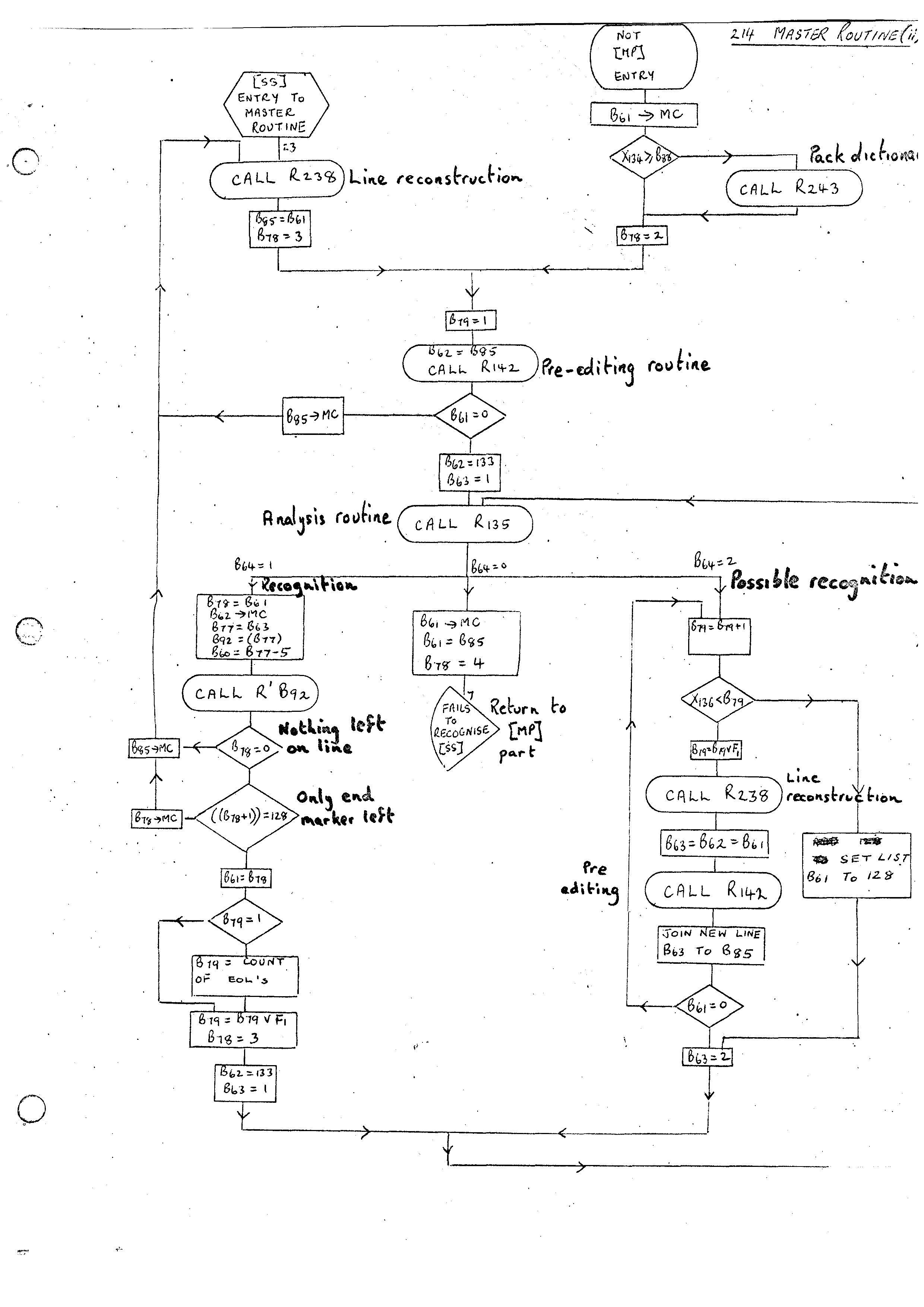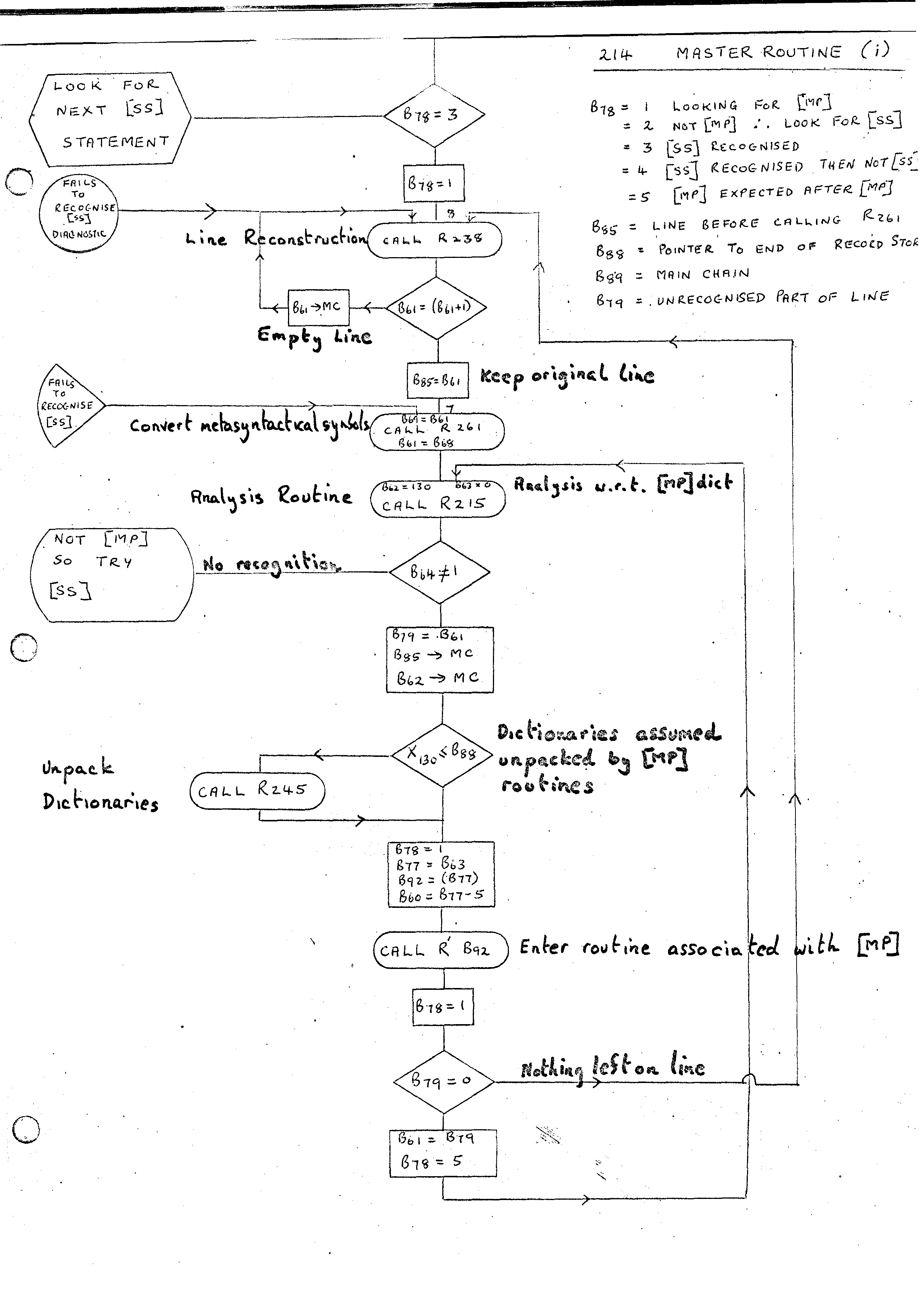 We are now in a position to define the action of the Master Routine 214. Brackets will be used in the Compiler-Compiler convention. For example (B61 + 1) means the contents of the address B61 +1. We have> therefore:-