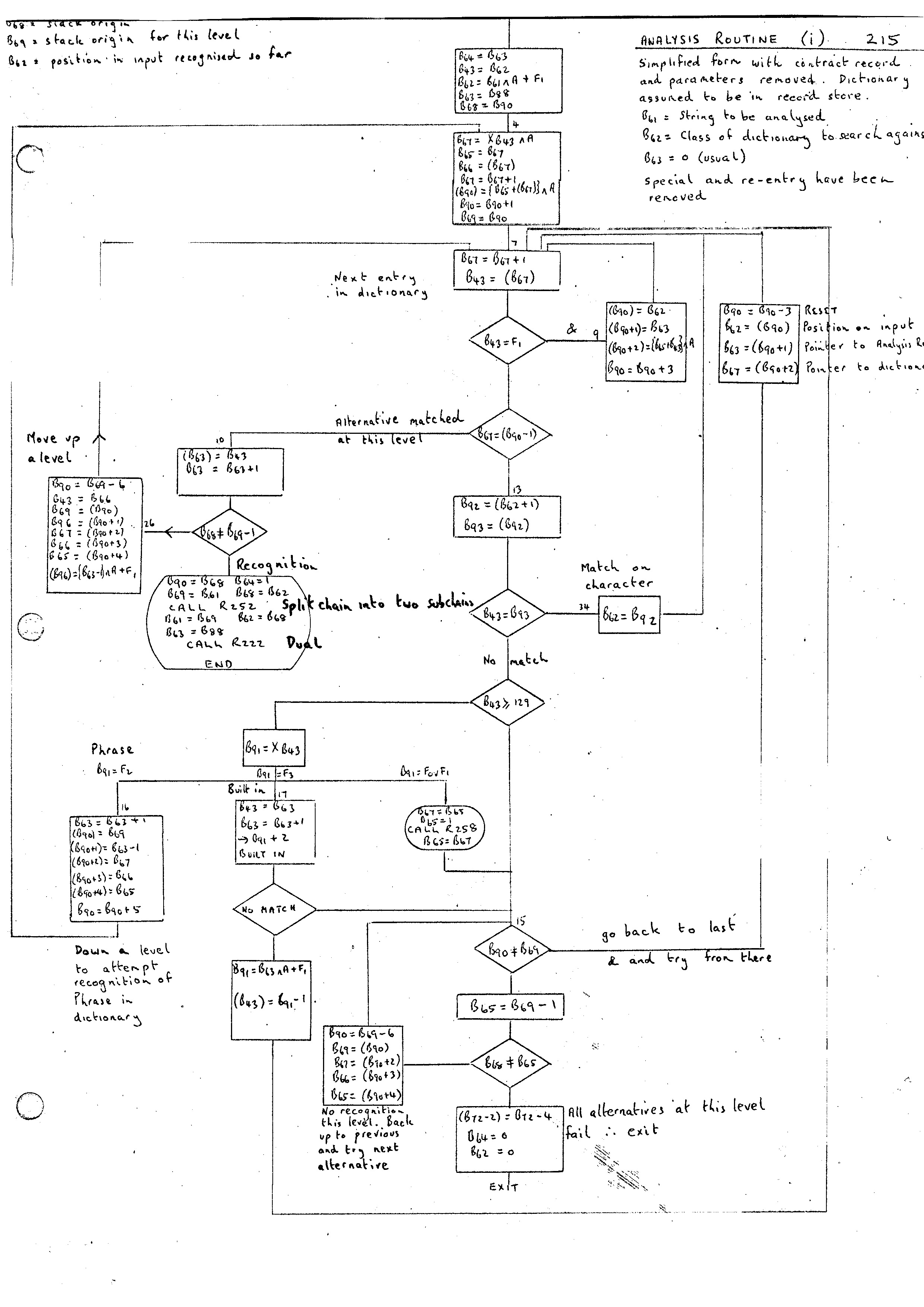 Once a [STATEMENT] has been recognized it may be possible to compile the statement if a Compile version of the Routine associated with the statement exists. The Compile routine is called as long as no parameters exist in the statement. This is done by checking the Analysis Record for P' words. P' words will appear whenever a Phrase Variable is recognized in a [RESOLVED-P]. This can be seen in the flow diagram (ii) for the Analysis Routine 215 (lower left). If a Phrase Variable is recognized then the Analysis Record produced consists of the second word produced by the Identifier Conversion Routine (see 6.2) with an F field set to 2 (P word). If in [RESOLVED-P] then it is a parameter P' in which case the J4 bit is set. This is achieved by [SETP'] setting B44 to J4 + F3 and [RESET P] resetting B44 to F3.
