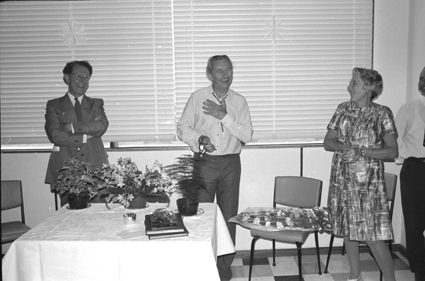 The Laboratory staff, together with a small group of friends and colleagues, gathered together to give him an informal luncheon party and afterwards Mr Christopher Jolliffe, one time director of Science Division, SRC presented him with a hall-marked sterling silver tumbler cup (a copy of a travellers' wine cup in use during the sixteenth and seventeenth centuries).