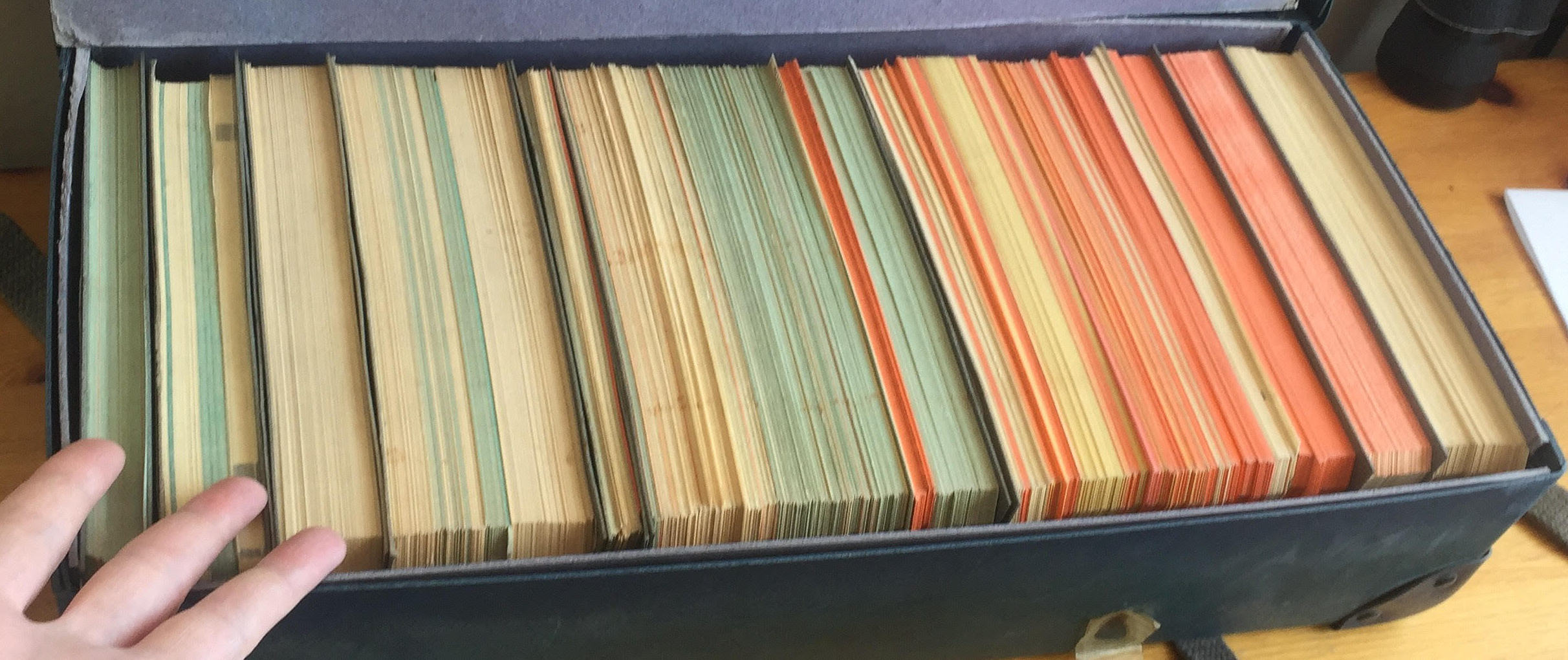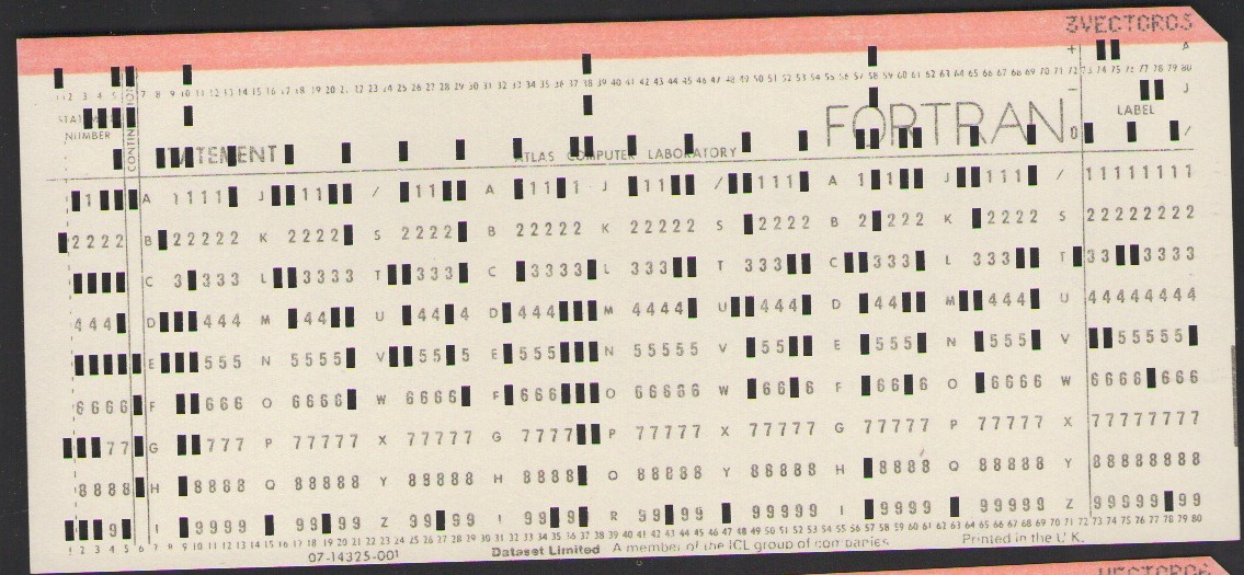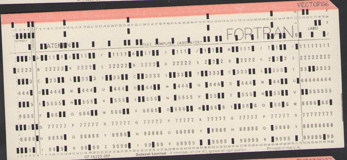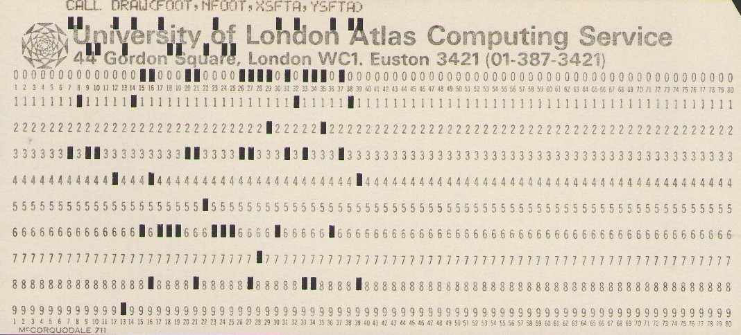 The card box included several card decks destined for the London Atlas Computing Service. Most cards had printing across the top, rather faded at times. Some had no printing. It was then necessary to read the hole punching.