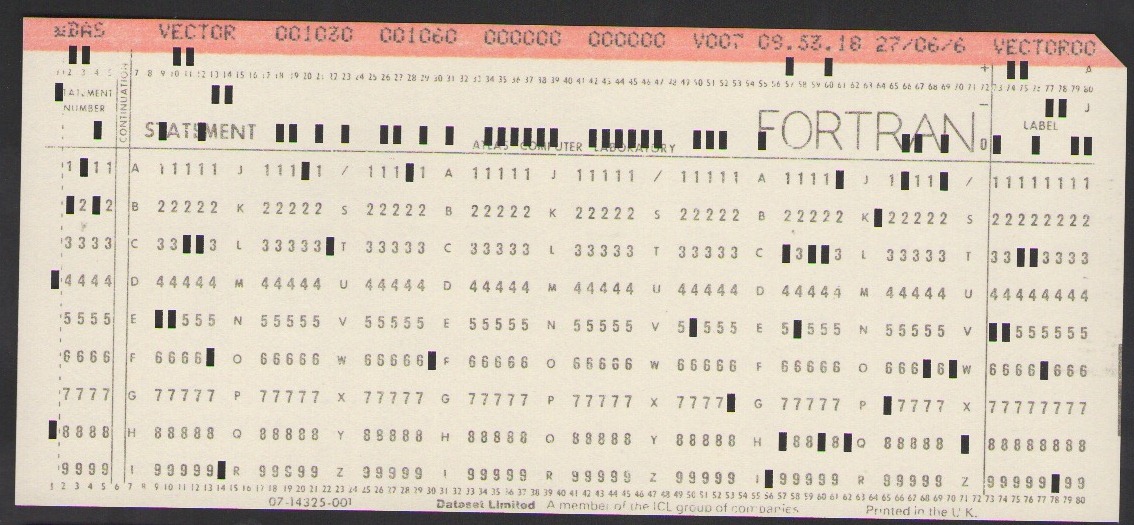 BAS cards are relatively easy to read but quite time consuming. Columns 7 and 8 give the relocatable address for the 16 instructions on the card. On loading, addresses will be incremented to the actual position in the memory where the routine will be executed. Starting at column 9 the columns 9-12 have the 48 hole positions making up the first 48-bit Atlas word. A hole punched indicates a 1 and no hole punched a zero. You start at the top of the first column and finish at the bottom of the fourth column. Columns 13-16 give the next word and so on. What you find may be an Atlas instruction, alternatively it can be a data value. Unless you know what the code generated by the compiler is likely to be, it is a bit hit and miss trying to work out which it is. It is somewhat helped by the columns 2-4 that say whether each half-word on the card contains an address that needs to be relocated.