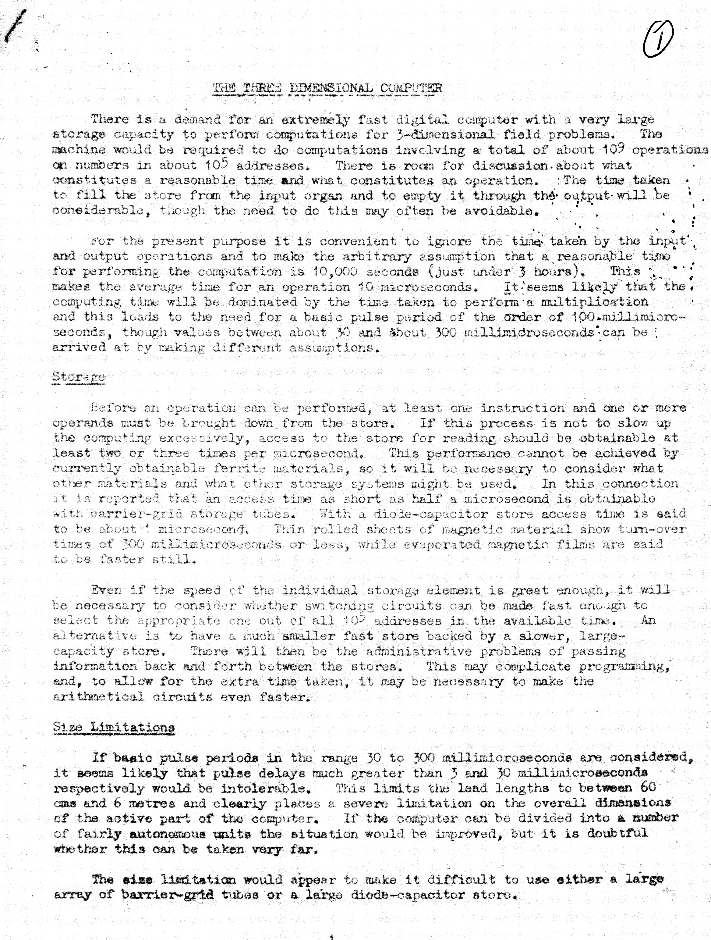 There is no date or author shown on the source document. However, Dai Edwards is sure that this paper was presented at the meeting held on 30th April 1957 at UKAEA. This meeting was called by John Cockcroft. Present were some invited UK computer users and designers (including Kilburn, Wilkes from Cambridge and Strachey from NRDC). The purpose was to discuss technical problems and requirements for a high-speed computer. When the Minutes of the meeting came out, the Three-dimensional computer document was described as 'intended to be read in conjunction with the Minutes'. Dai Edwards suggests that probably Jack Howlett (or possibly E H Cooke-Yarborough) was the author of the paper.