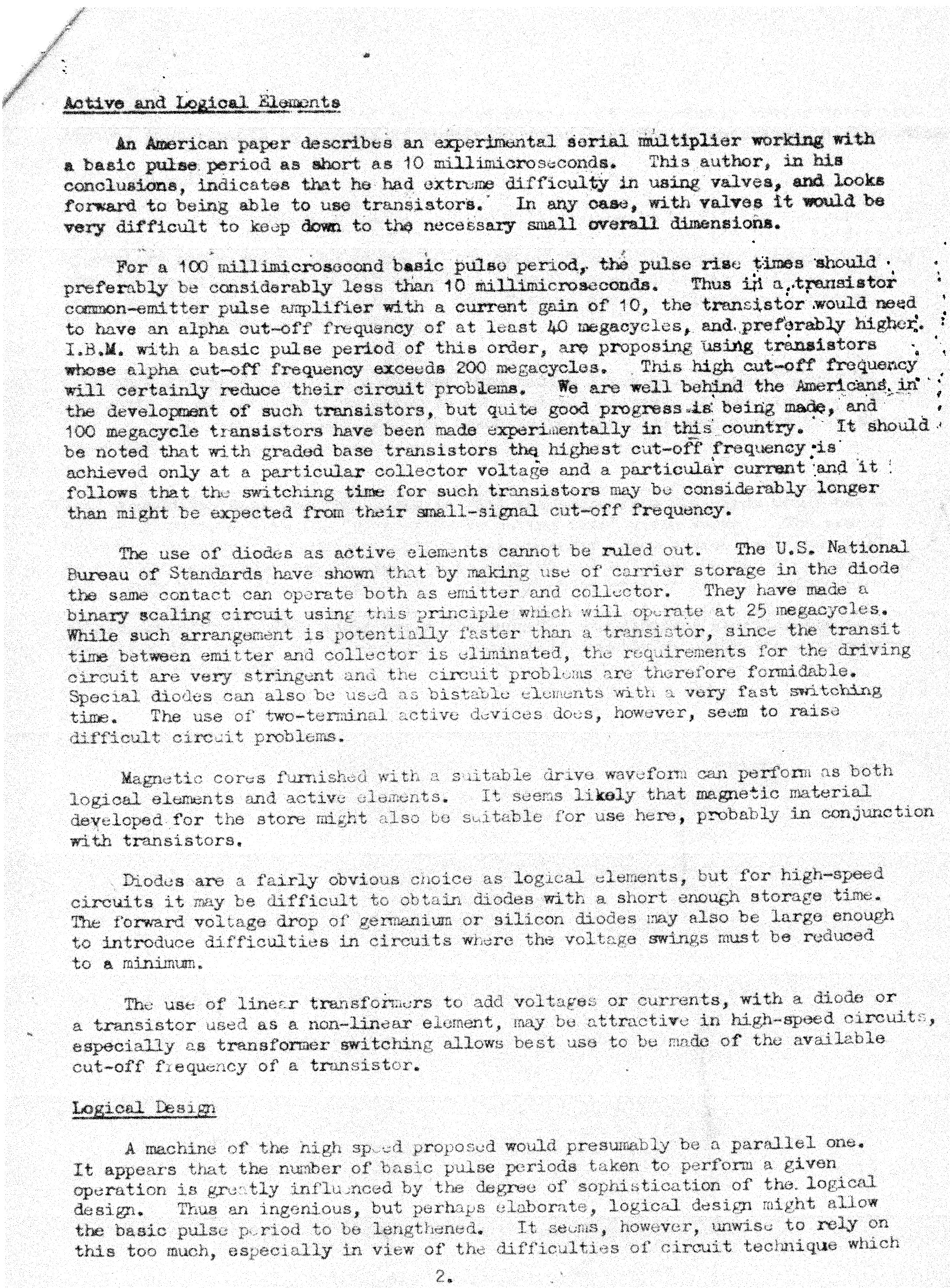 A machine of the high speed proposed would presumably be a parallel one. It appears that the number of basic pulse periods taken to perform a given operation is greatly influenced by the degree of sophistication of the logical design. Thus an ingenious, but perhaps elaborate, logical design might allow the basic pulse period to be lengthened. It seams, however, unwise to rely on this too much, especially in view of the difficulties of circuit technique which are likely to be encountered at high pulse rates. It is probable better to regard logical improvements as a means of regaining speed lost due to unforeseen difficulties.