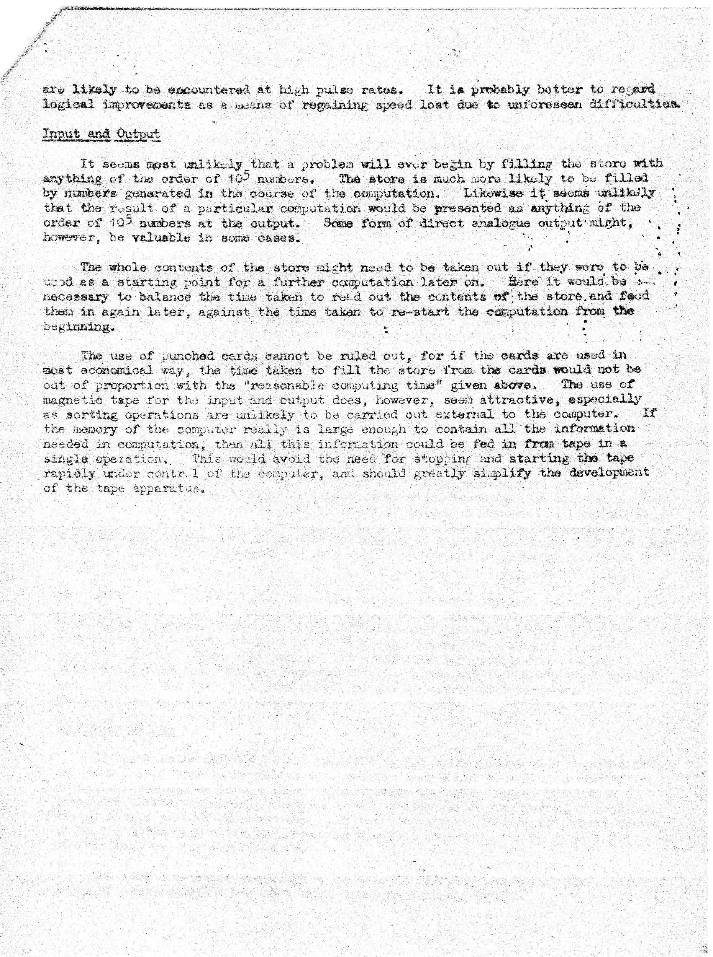 The use of punched cards cannot be ruled out, for if the cards are used in most economical way, the time taken to fill the store from the cards would not be out of proportion with the reasonable computing time given above. The use of magnetic tape for the input and output does, however, seem attractive, especially as sorting operations are unlikely to be carried out external to the computer. If the memory of the computer really is large enough to contain all the information needed in computation, then all this information could be fed in from tape in a single operation. this would avoid the need for stopping and starting the tape rapidly under the control of the computer, and should greatly simplify the development of the tape apparatus.