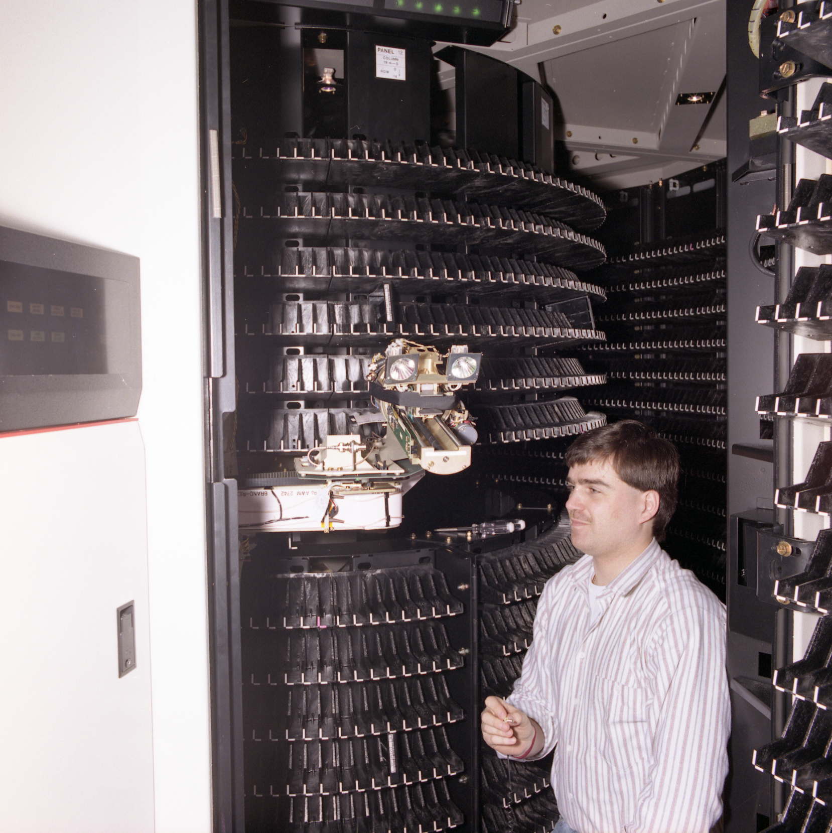 The ACS system to be installed will be able to store up to 5500 tape cartridges equivalent to a total storage capacity of over a TeraByte of data. The robot can retrieve a cartridge and move it to the drive unit on average in about 11 seconds. Data stored in an ACS can now be considered as Online data! Further storage modules can be added to the system according to the demand and of course subject to the availability of sufficient funding. Each unit so added would have its own robot and cartridges can be passed from robot to robot.