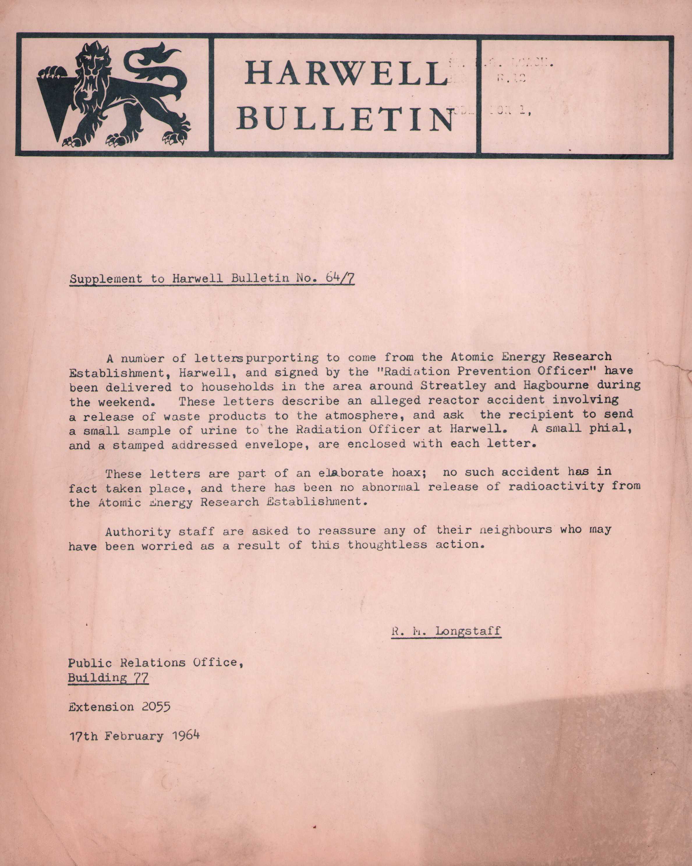 Harwell found themselves having to rebut a letter purportedly from the Radiation Prevention Officer following a prank inspired by this and other experiments of a questionable nature:
