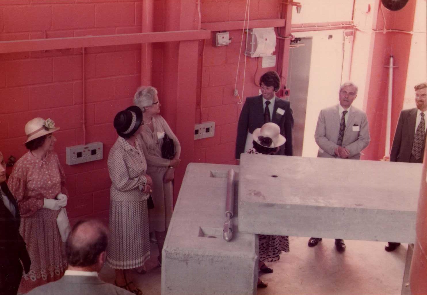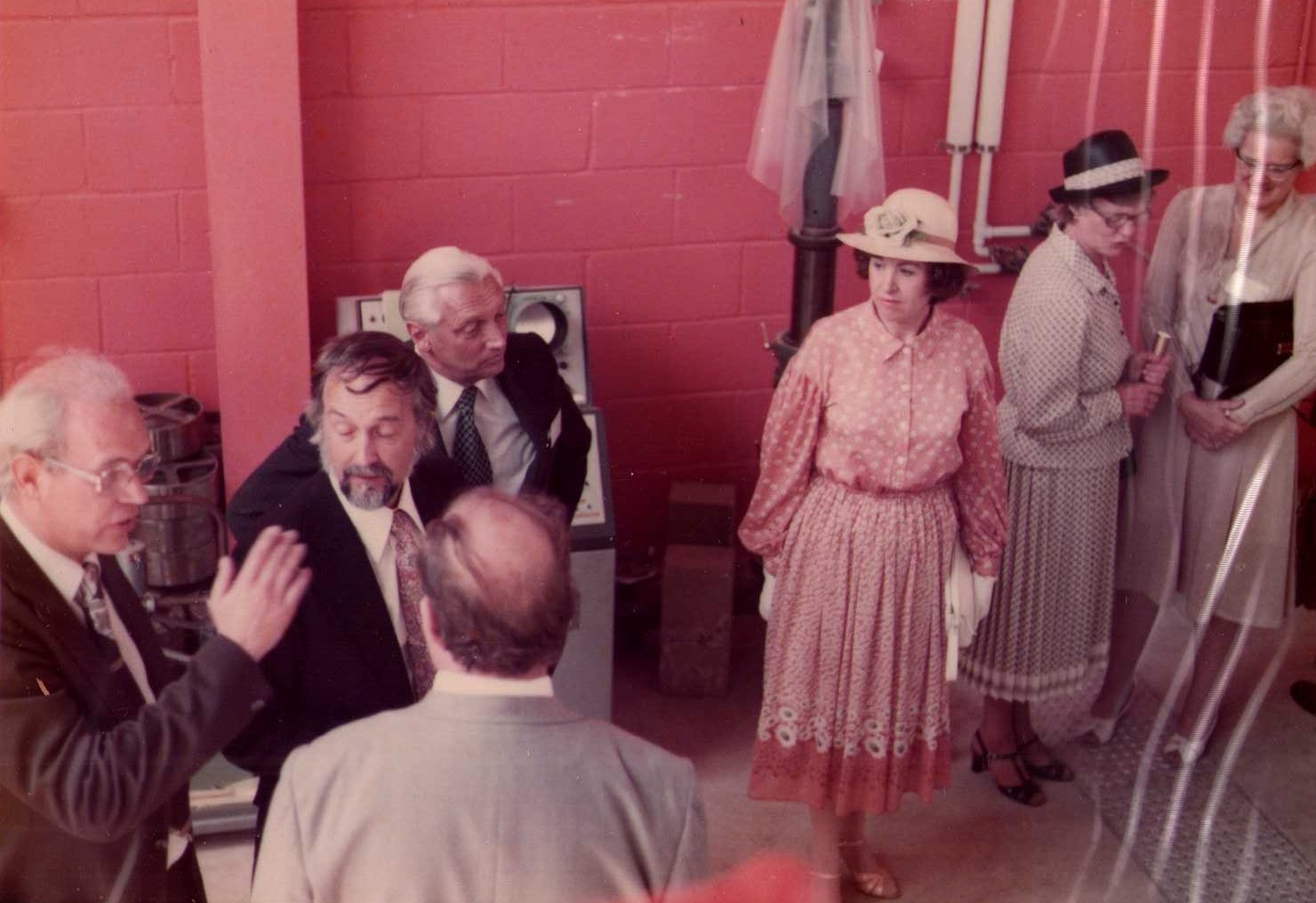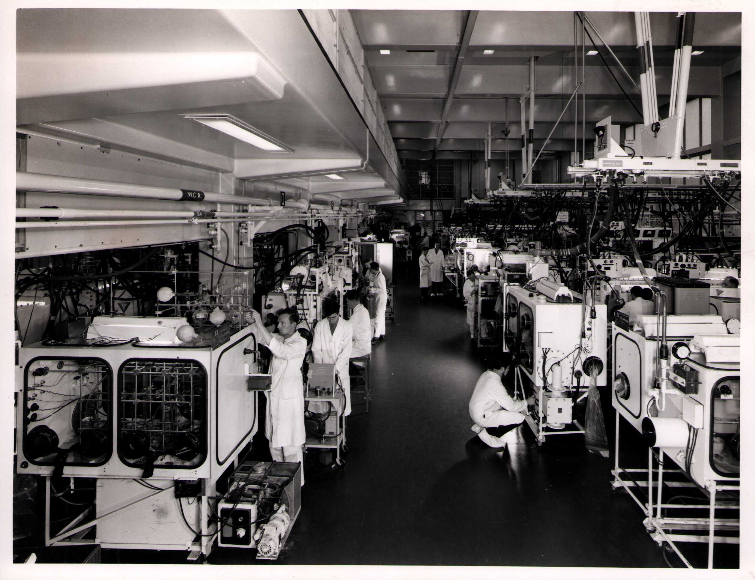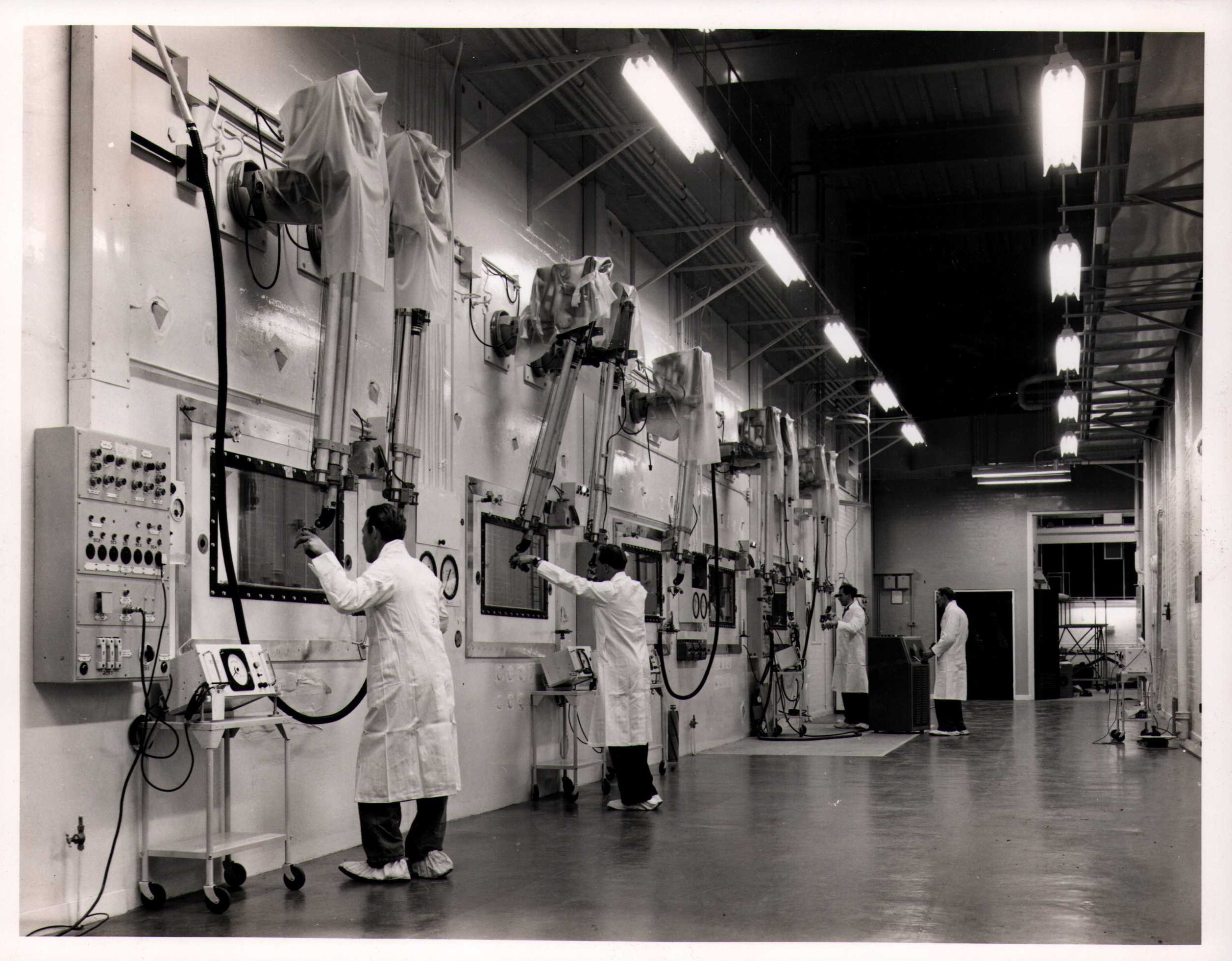 At Harwell studies are made on the chemistry of the heavy elements (uranium, neptunium, plutonium etc). The work is done in glove boxes -- completely closed boxes with transparent Perspex windows. Instruments and chemical apparatus are manipulated manually through neoprene gloves sealed into "ports" in the Perspex windows.