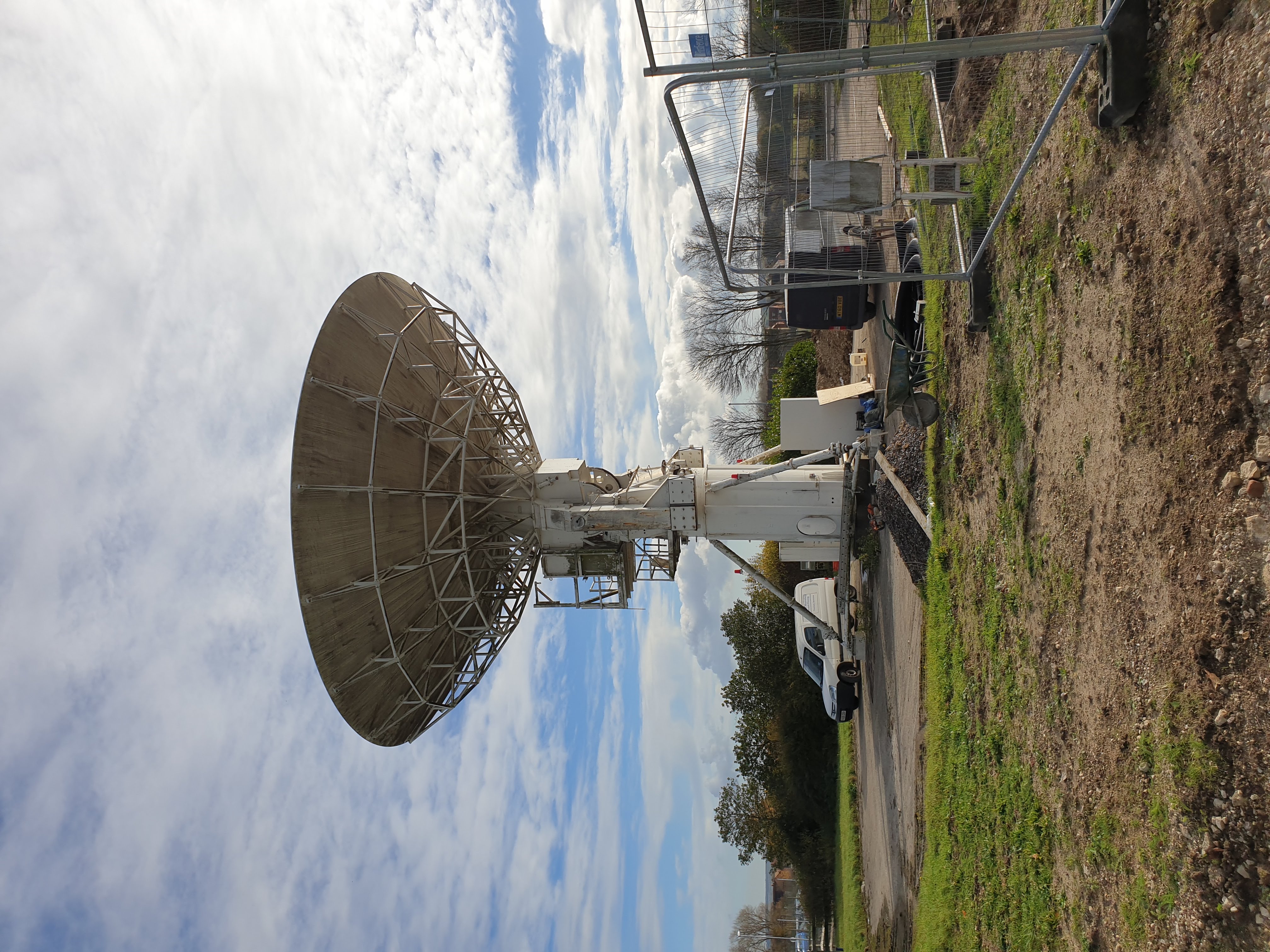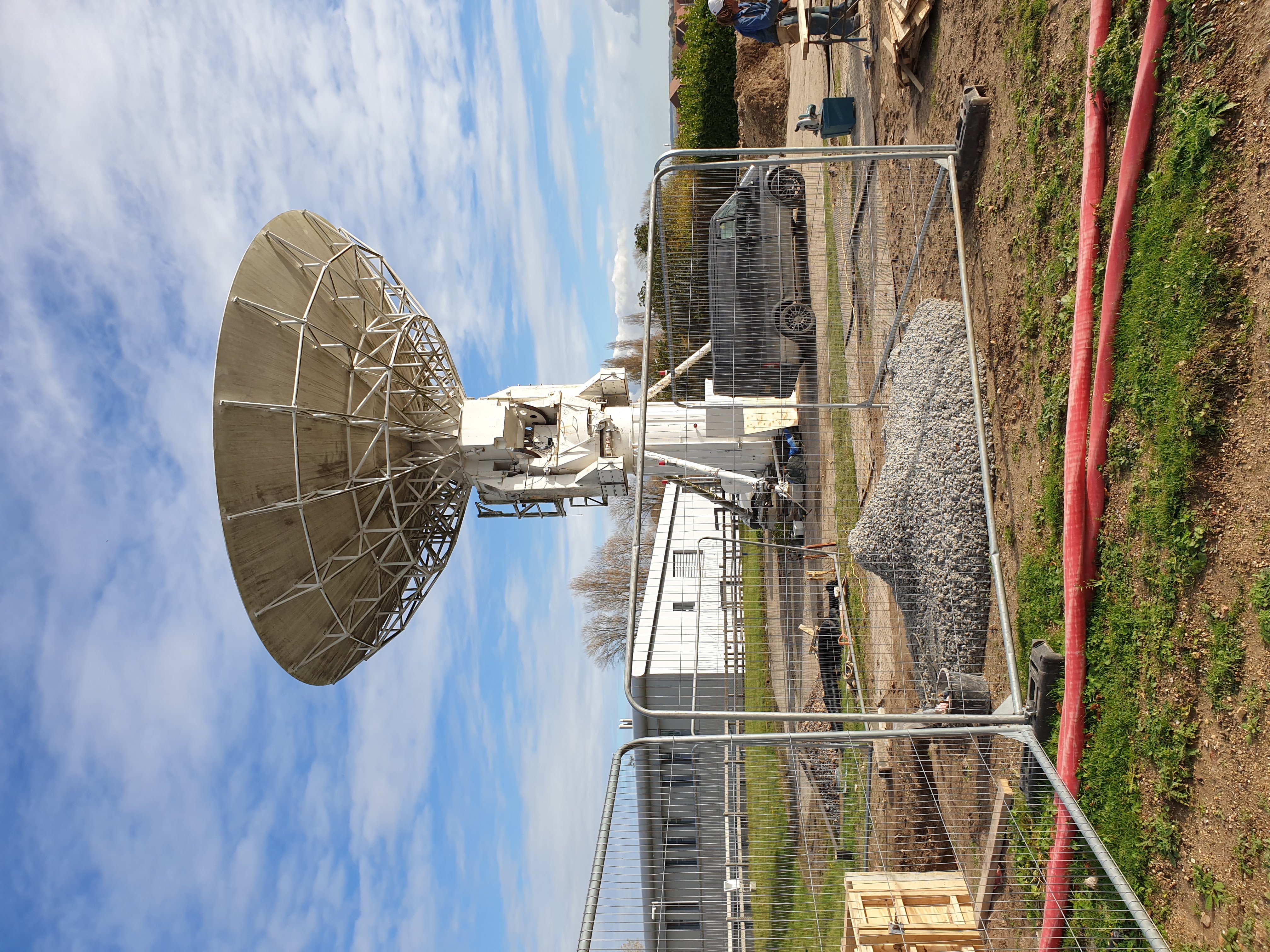 Formal negotiations with NASA to acquire the transportable dish and with firms to place a contract for its removal to Slough took a little while, but finally the arrangements were made, and Les Martin and Ralph Downton spent some time in the Mojave Desert watching our chosen contractors pull the dish to pieces -- which they did very effectively! The pieces were taken to beautiful downtown Burbank for packing, hauled across the USA to New York, and shipped to Greenock -- where Les was on hand to make sure they didn't drop it in the water. Finally it was hauled down to Slough and now sits at the end of the road beyond Hut 1 -- as most people will now have seen.