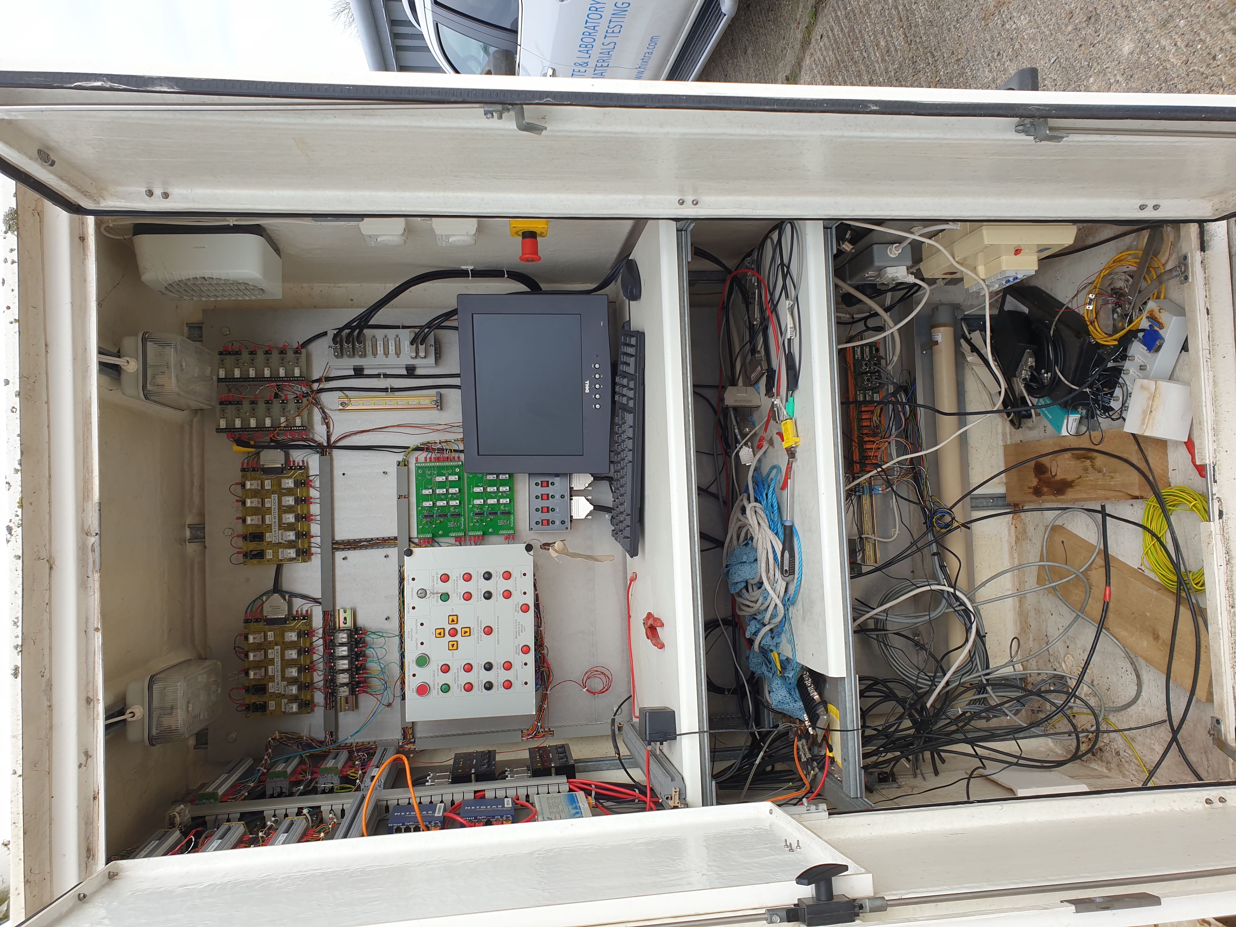 Originally it was proposed to make use of the 25m dish aerial at Chilbolton. This had the disadvantages of being relatively removed from Slough (which created problems in getting large volumes of data to the Slough Control Centre), of interfering with the various in-house and university research programmes on the Chilbolton dish, and of being larger than really necessary for the reception of IRAS telemetry (a 12m dish would do). Nevertheless, project finances didn't allow us to consider buying another dish, and there seemed to be no choice in the matter; that is, until some of the American participants in IRAS, working at NASA's Jet Propulsion Laboratory in Los Angeles, drew our attention to a NASA 12m dish aerial which had been standing unused for some while, in the Mojave Desert about 150 miles inland from Los Angeles. The Mojave Desert is so littered with NASA tracking stations that you feel they could easily spare one or two, and this is just about the way it is: on the one site they had not one but two 12m aerials, both out of service. Choosing one looked easy: the one was designed to be transportable, is designed for easy disassembly and re-erection, and comes with a couple of road trailers which carry most of the bits and pieces; the other weights half as much again and, pursuing our Egyptian metaphor, looks almost as permanent as the Pyramids! On the other hand, our chosen aerial needed work on the drive system, whose moving parts might well need quite a lot of attention after being stationary for a few years. We chewed over the pros and cons but in the end the likely disassembly cost of the heavier dish looked so horrendous that we opted for the transportable one.