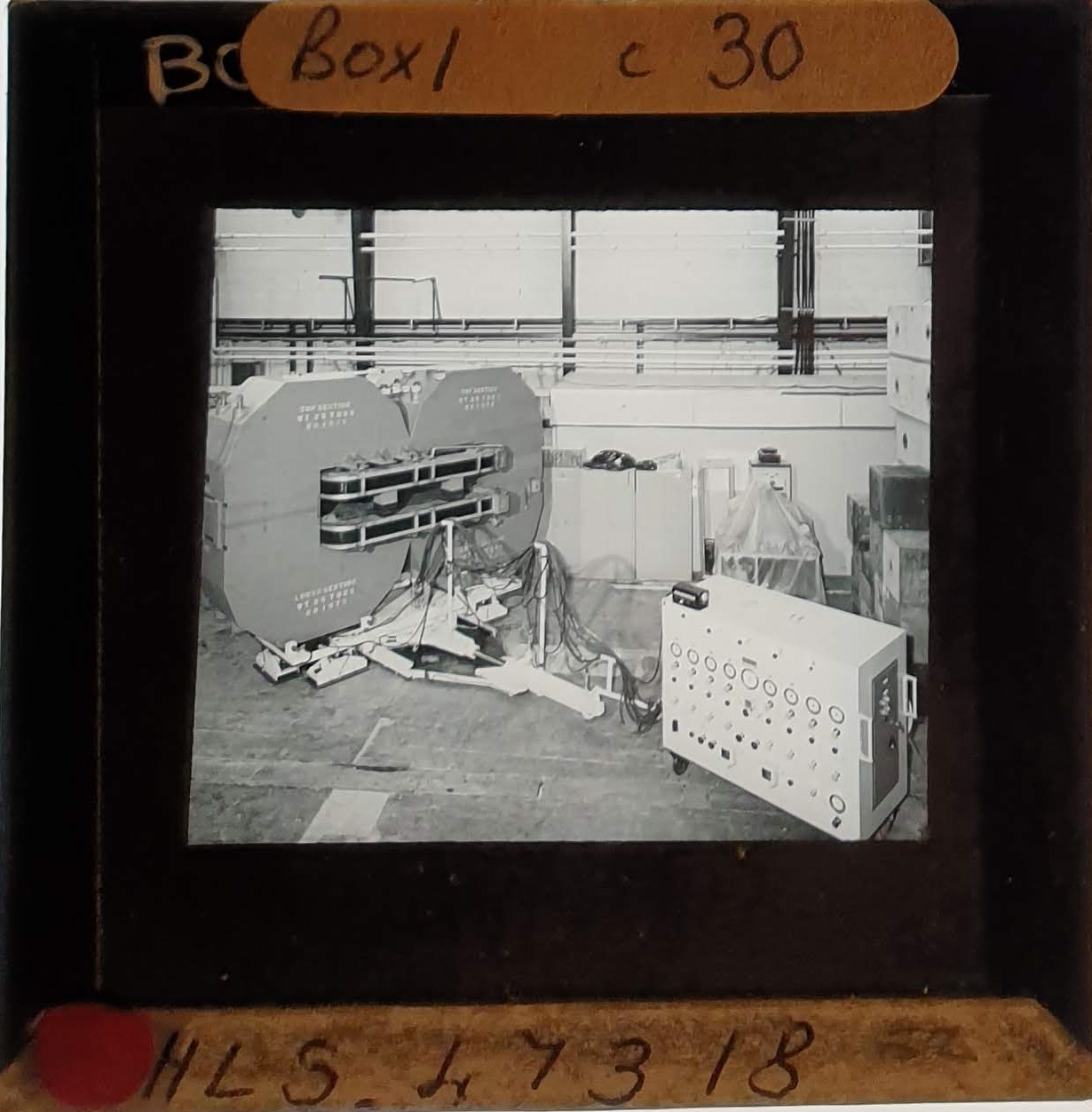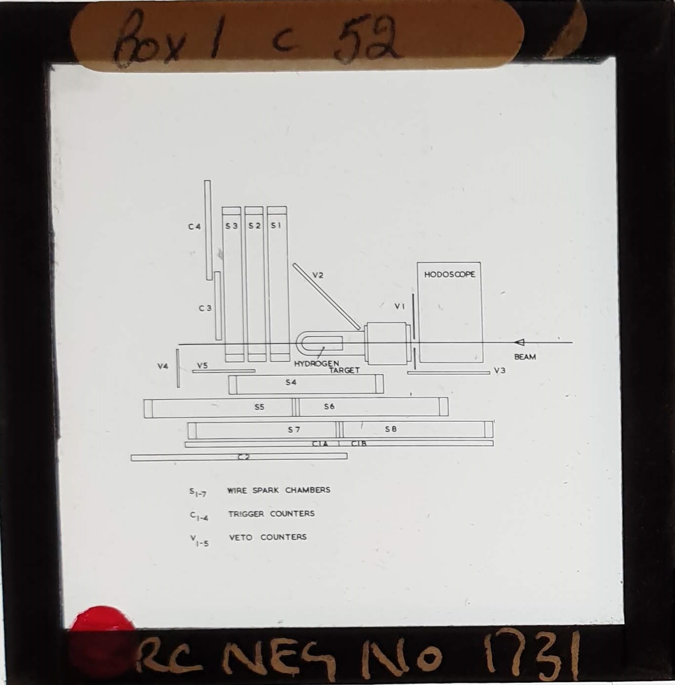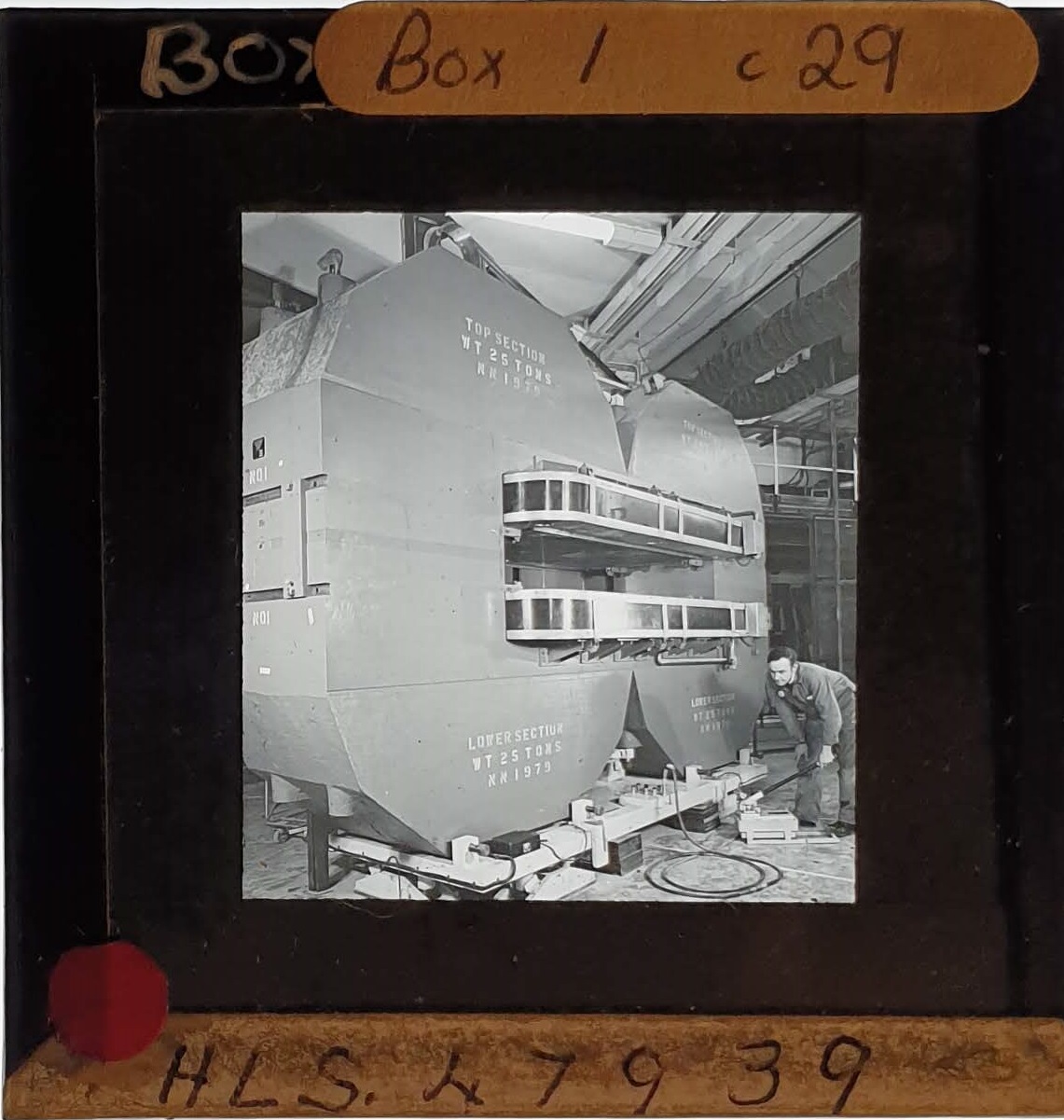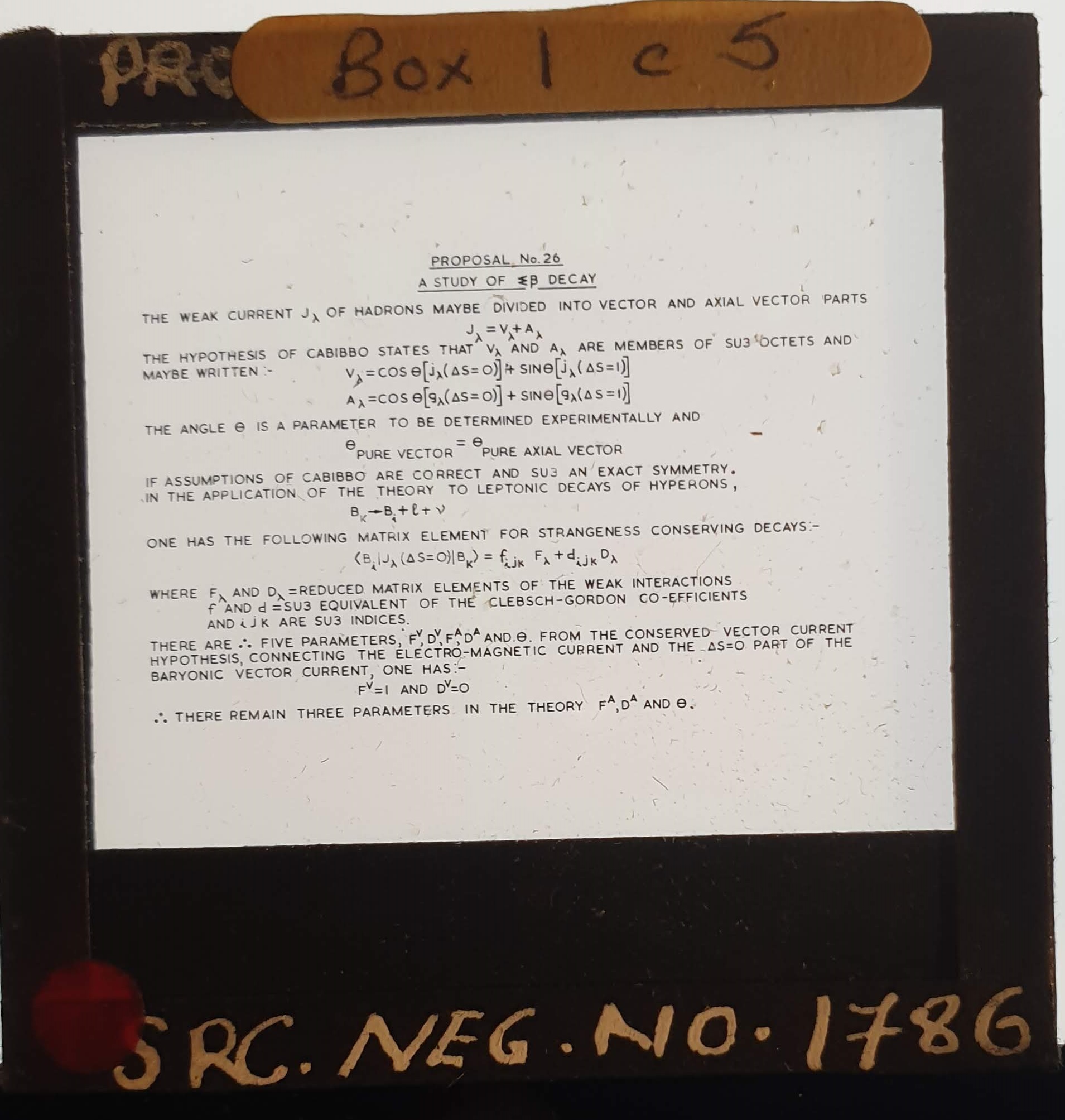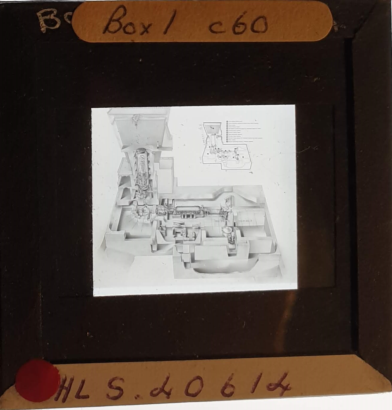 Amongst the artefacts discovered in the archives are a number of wooden boxes of 3¼ inch (8cm) photographic slides, plus wooden boxes and four-drawer metal cabinets of 2 inch (5cm) slides. The larger slides are of the PLA, the smaller slides are of the PLA and Nimrod and have been photographed simply as a record. Initials in the photograph ID are the series ID, though what each series actually is unclear. Most of the slides have been labelled with a negative number, slide sequence number and sometimes a box number but sometimes these labels are obscured, have fallen off altogether or the slide may have been "borrowed" then put back in the wrong place.